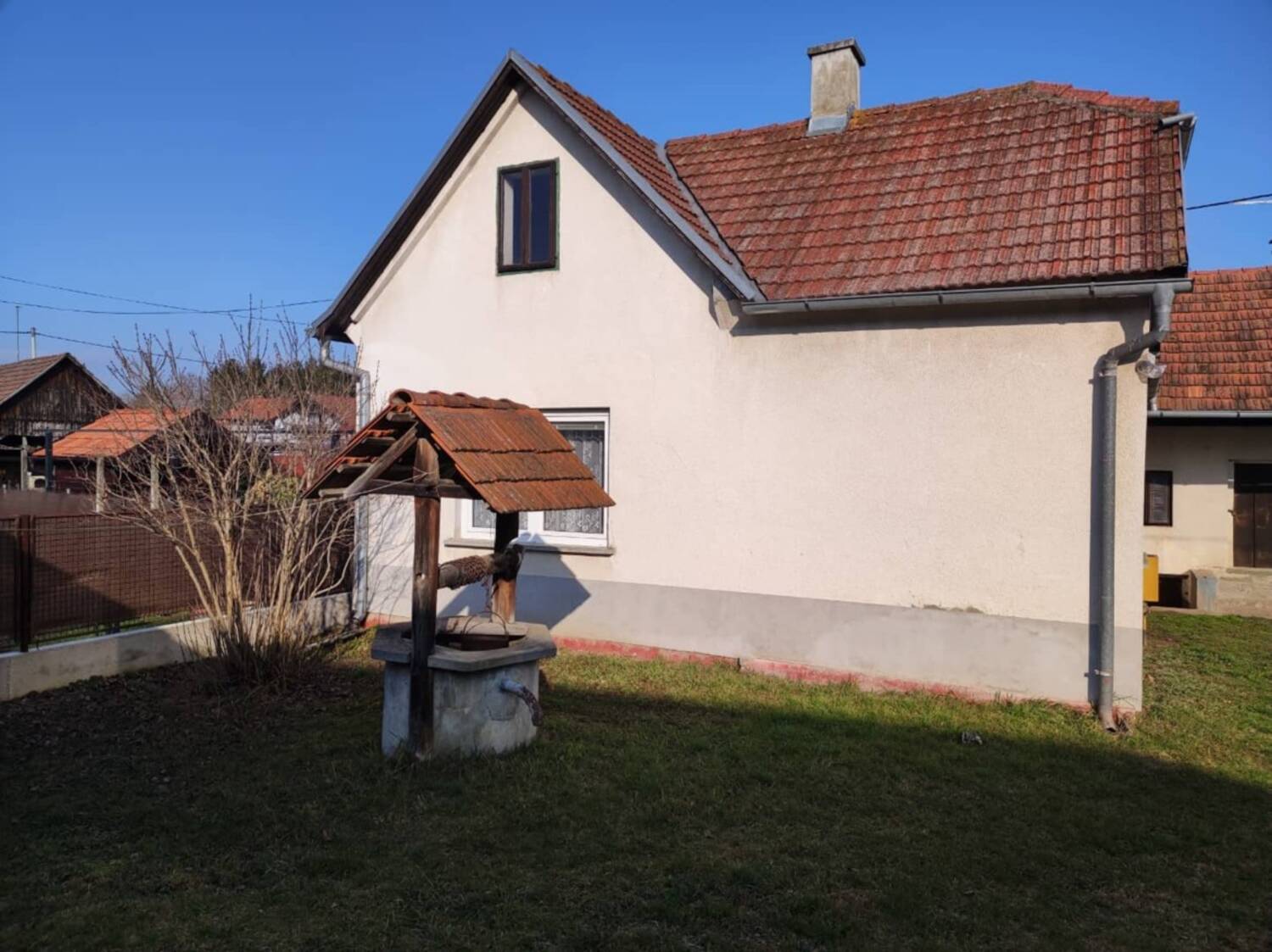 -Kuća ima sve priključke,struja,voda,plin, kanalizacija.Kuća se sastoji od stambene zgrade 136m2, dvorište 470m2,voćnjaka- vrt 1059m.