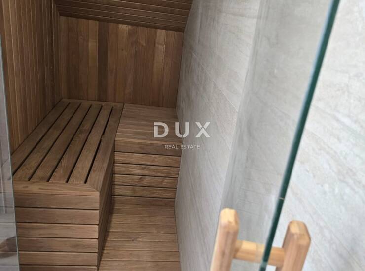 Unutarnji raspored je pažljivo osmišljen – donji kat čini prostrani dnevni boravak u open space konceptu s blagovaonicom i kuhinjom po mjeri opremljenom Electrolux aparatima, a tu je i privatna wellness zona s finskom saunom, tušem i dodatnim WC-om. Na katu se nalaze dvije spavaće sobe s portugalskim plutanim podovima, svaka s vlastitom en-suite kupaonicom.