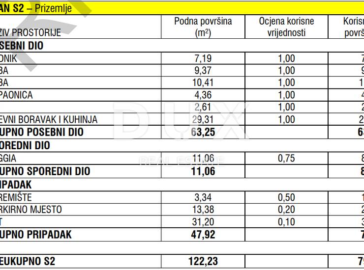 Površina stana iznosi 79,02 m2 netto, a sastoji se od prostranog dnevnog boravka, moderne kuhinje, dvije udobne spavaće sobe, kupaonice te dodatnog WC-a. Iz dnevnog boravka izlazi se na lijepu lođu, savršenu za opuštanje uz jutarnju kavu ili večernje druženje. Dodatnu pogodnost čini privatni vrt površine 31,20 m2, koji pruža prostor za uživanje na otvorenom ili sadnju bilja.