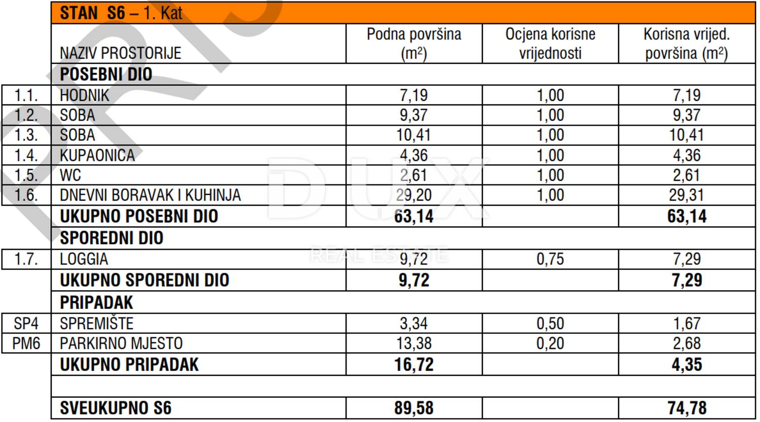 Površina stana iznosi 74,78 m2 netto, a sastoji se od prostranog dnevnog boravka, moderne kuhinje, dvije udobne spavaće sobe, kupaonice te dodatnog WC-a. Iz dnevnog boravka izlazi se na lijepu lođu, savršenu za opuštanje uz jutarnju kavu ili večernje druženje.