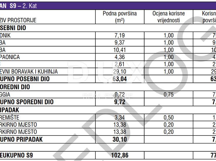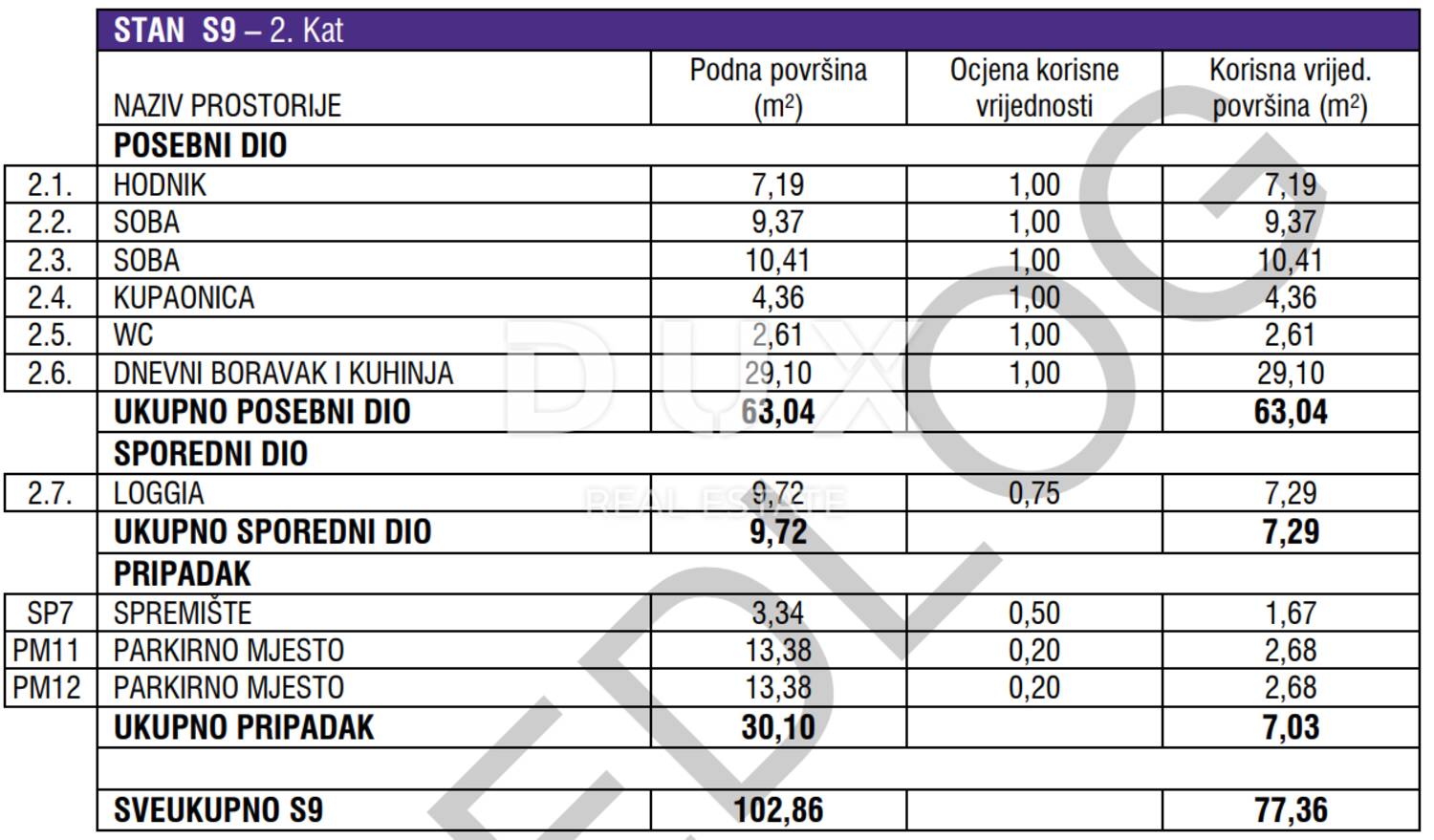 Površina stana iznosi 77,36 m2 netto, a sastoji se od prostranog dnevnog boravka, moderne kuhinje, dvije udobne spavaće sobe, kupaonice te dodatnog WC-a. Iz dnevnog boravka izlazi se na lijepu lođu, savršenu za opuštanje uz jutarnju kavu ili večernje druženje.