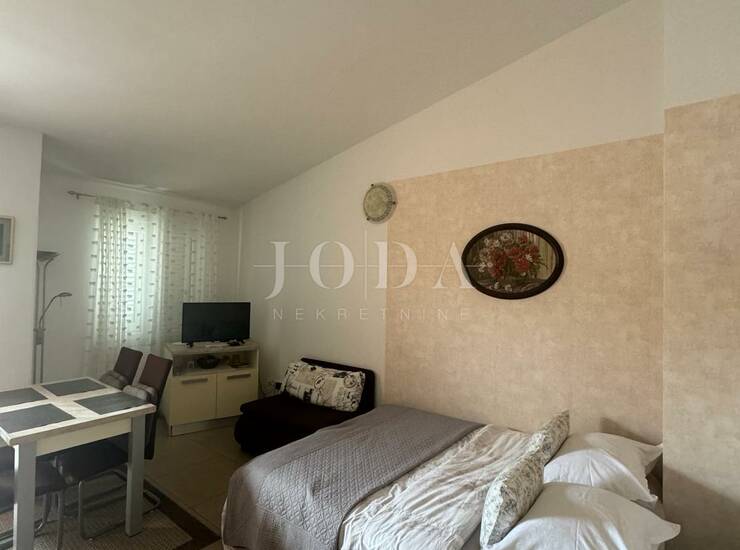 Prostrani balkon sa kojeg se pruža otvoreni pogled na more, blizina šljunčanih plaža i svih sadržaja, restorani, trgovine, kafići.
