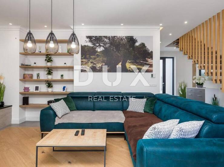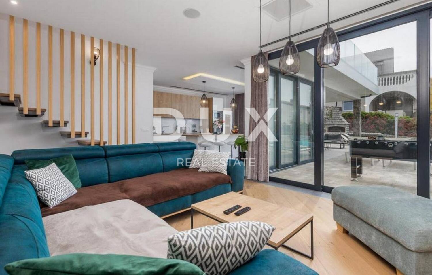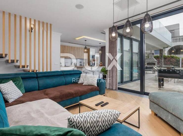 U prizemlju se nalazi prostrani dnevni boravak s kaminom, potpuno opremljena moderna kuhinja s perilicom posuđa, spavaća soba s vlastitom kupaonicom, dodatni toalet, praonica s perilicom i sušilicom rublja, kao i nekoliko spremišta. Elegantnim stepenicama dolazi se na kat gdje se nalaze dvije spavaće sobe s vlastitim kupaonicama, jedna dodatna soba bez kupaonice, galerija, još jedan toalet te dvije terase – velika terasa i manja terasa s pogledom na more.