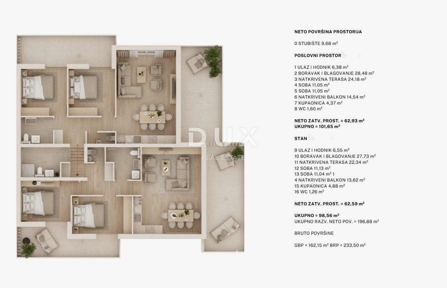 Vrhunski dizajn, moderan i funkcionalan dizajn sa premium završnim obradama, podnim grijanjem, klimatskim uređajima.