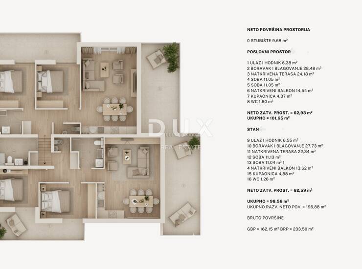 Vrhunski dizajn, moderan i funkcionalan dizajn sa premium završnim obradama, podnim grijanjem, klimatskim uređajima.