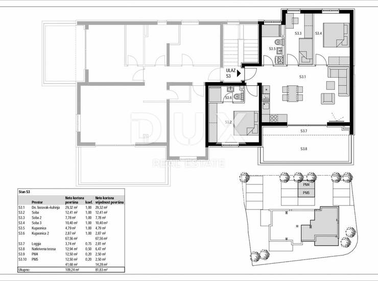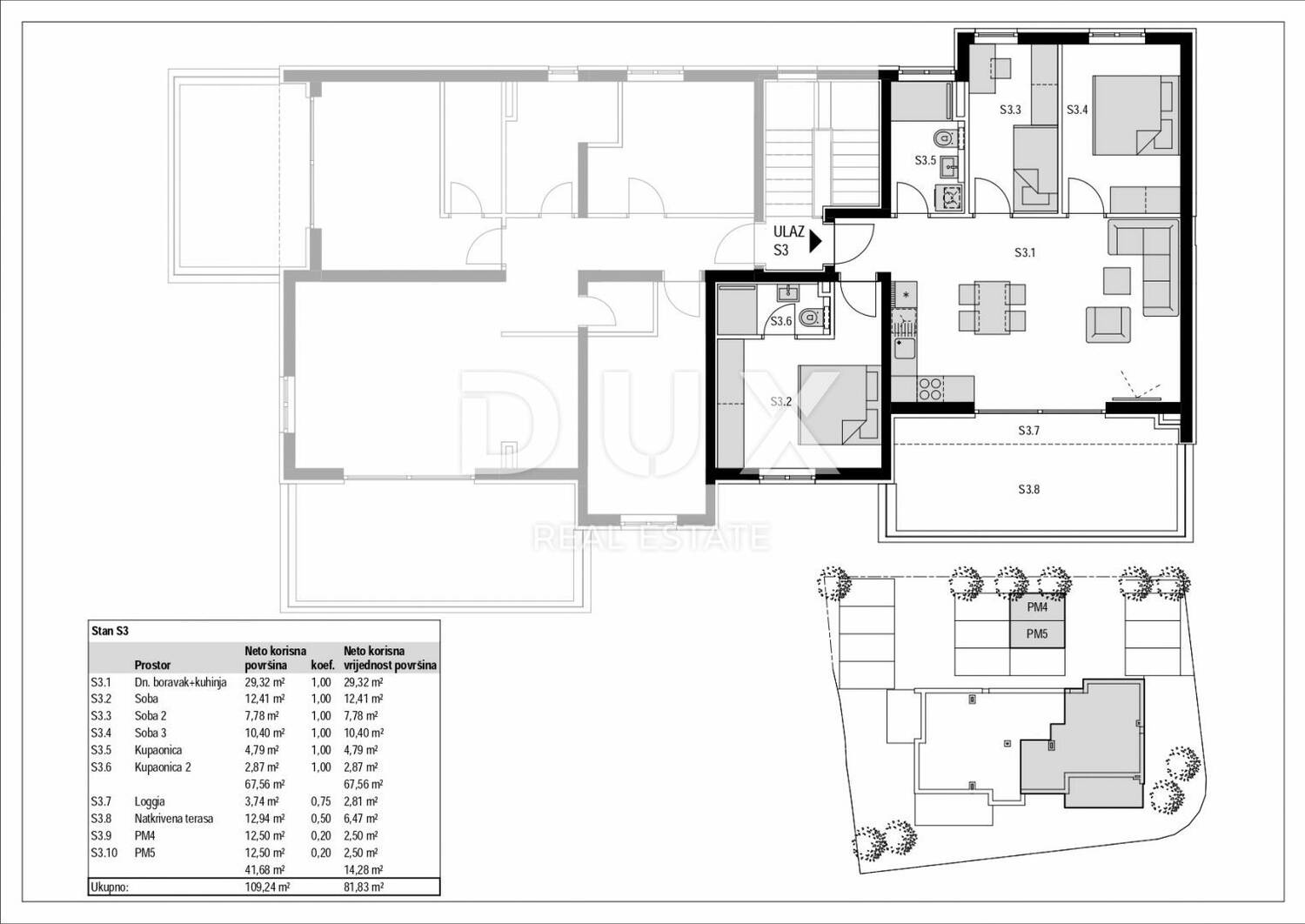 Prodajemo 3s+db apartman S3 sveukupne stambene površine od 109,24m2 na drugom katu.