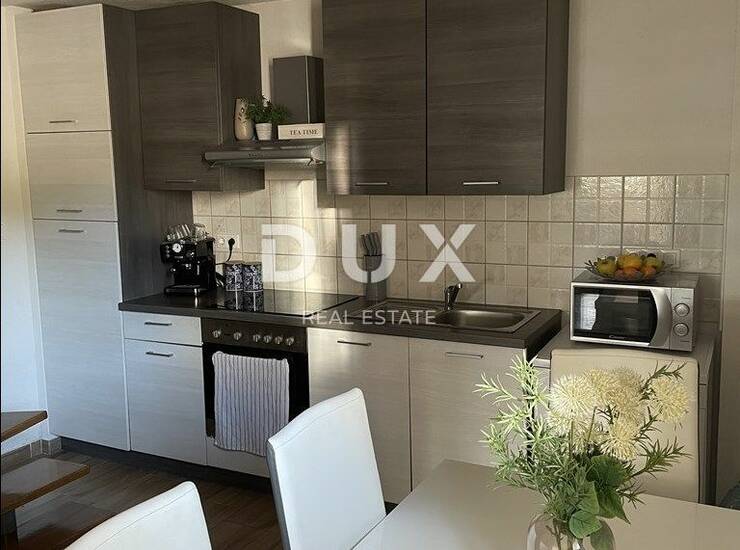 Prodaje se stan u zgradi novije gradnje. Stan se sastoji od dvije etaže. Prva prizemna etaža se sastoji od dnevnog boravka, kuhinje i blagavaonice, terasa te wc. Na drugoj etaži na koju se penje spiralnim stepenicama se nalaze dvije spavaće sobe te kupaonica s wc-om. Apartman je kompletno uređen i namješten te nema parkirno mjesto u vlasništvu, no funkcionira da se tokom sezone zakupi parkirno mjesto po iznosu od 300kn mjesečno. Na okućnici ima dovoljno prostora za parking van sezone. Odlična nekretnina svega 100 m od mora te ostalih bitnih sadržaja. PRILIKA!!! PREPORUKA AGENTA!!!