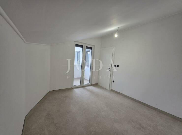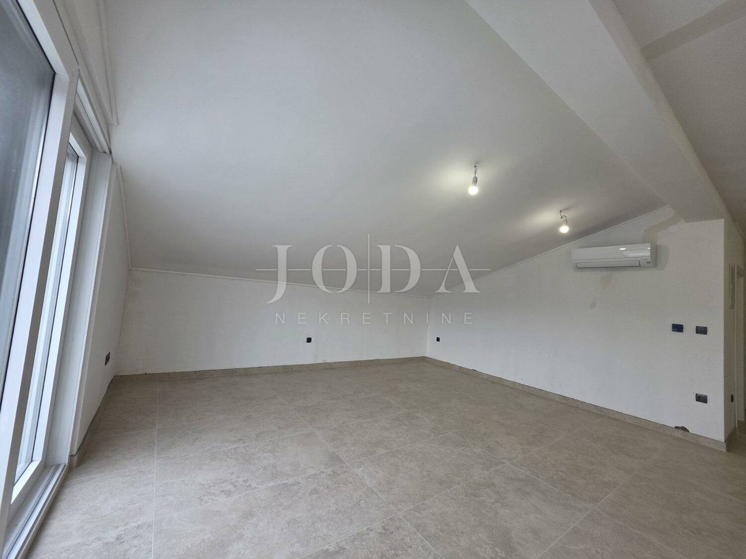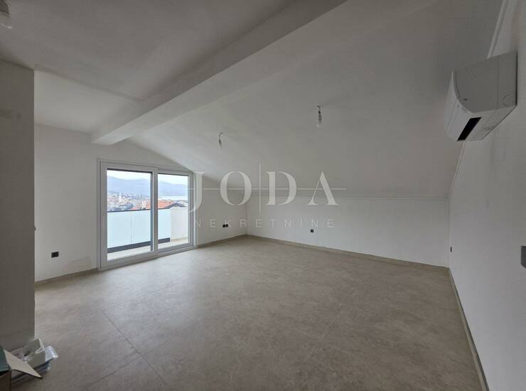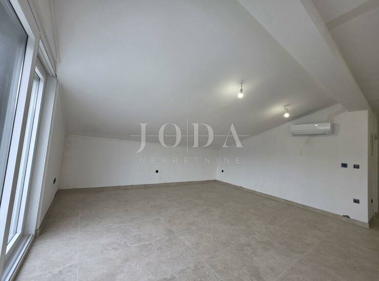 Novogradnja stan u potkrovlju ukupne površine 98,66m2. Sastoji se od kuhinje, dnevnog boravka, ulaznog hodnika, tri spavaće sobe, dvije kupaone, wc-a, balkona i loggie. Zgrada se gradi kvalitetnim materijalima, a stan će biti opremljen klima uređajima u svim sobama, podnim grijanjem, ALU stolarijom i protuprovalnim vratima. Stanu pripada jedno parkirno mjesto. Mogućnost kupnje garaže. Odlična nekretnina kako za život tako i za turistički boravk.