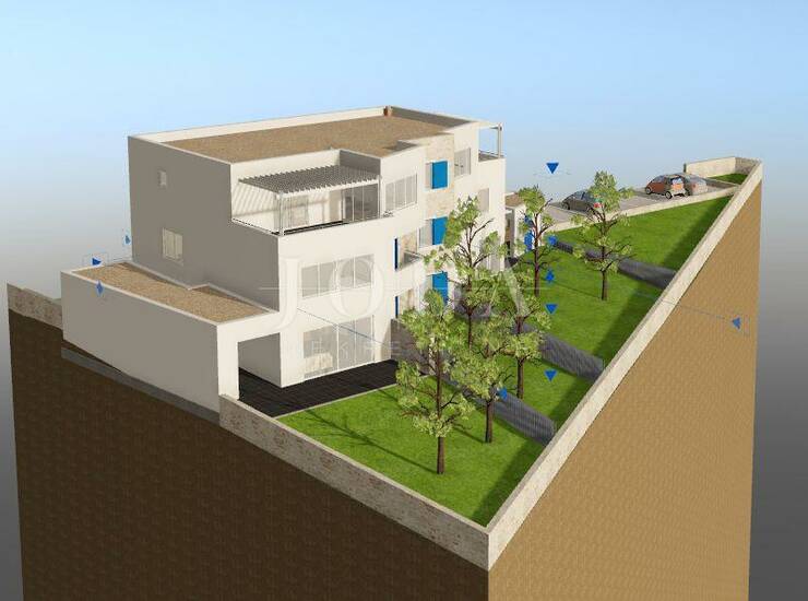 Povišena od glavne ceste,zgrada pruža pogled na more već sa prizemlja.Svi stanovi imaju u vlasništvu parkirno mjesto te je mogućnost kupnje garaže.