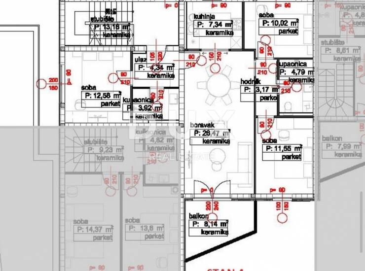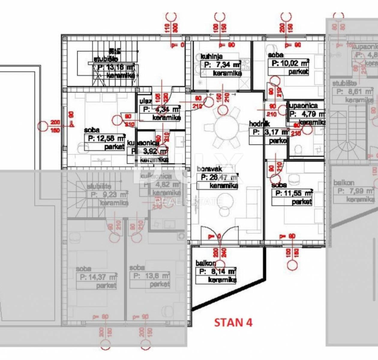 Stan S4 na 1. katu se sastoji od tri spavaće sobe, dnevnog boravka s kuhinjom i blagovaonicom, dva kupatila, hodnika i balkona. Stanu pripadaju dva parkirna mjesta.