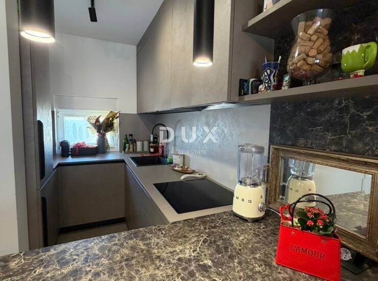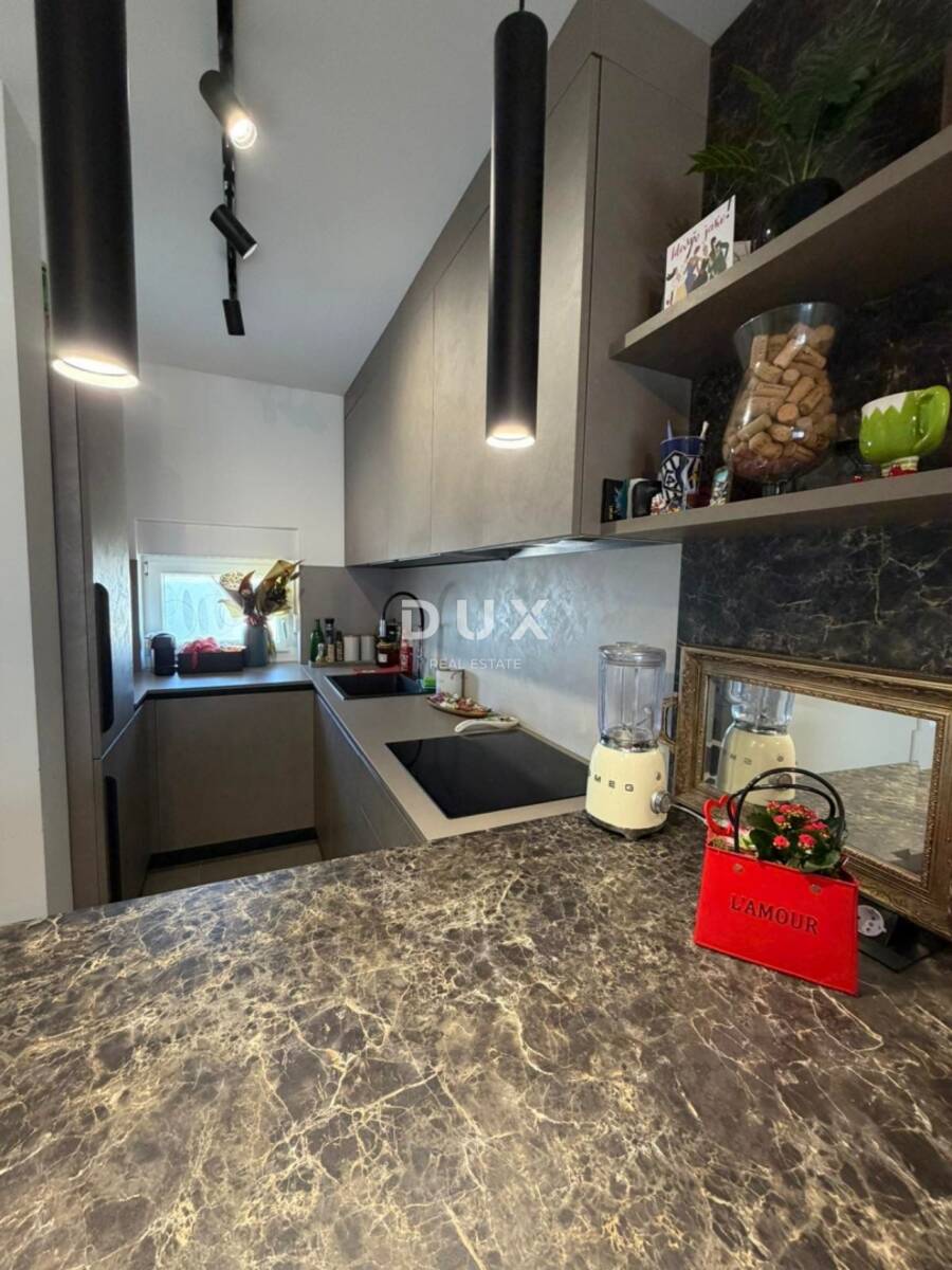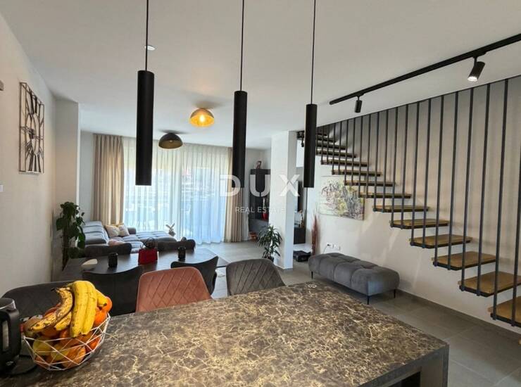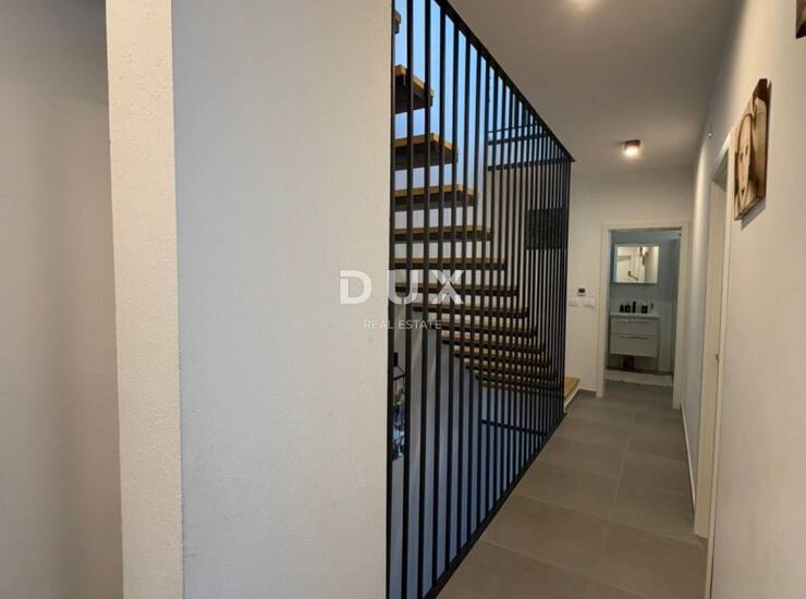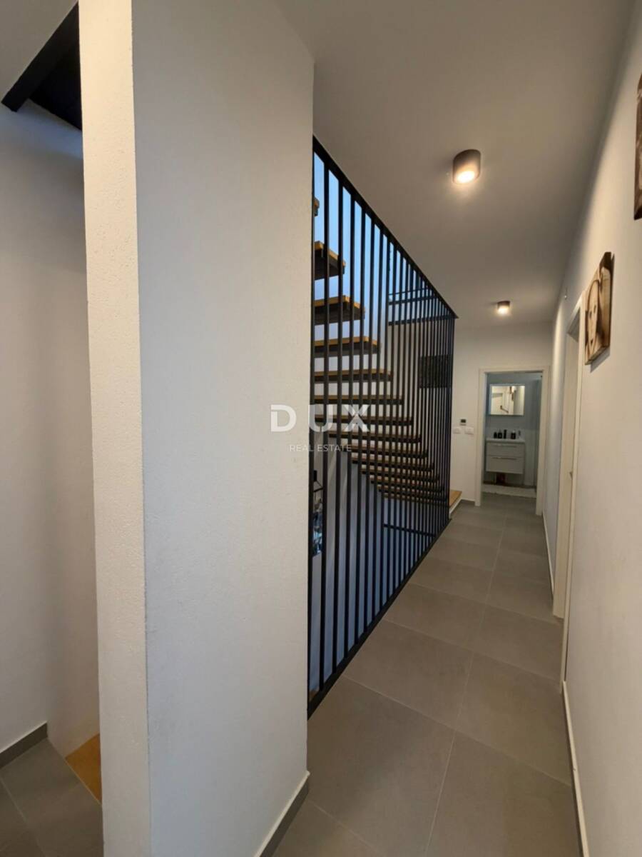 Na prvom katu smještene su tri komforne spavaće sobe i moderno uređena kupaonica, pružajući dovoljno prostora za veću obitelj ili goste. Drugi kat rezerviran je za privatnost i luksuz, prostrana master spavaća soba s vlastitom kupaonicom, dodatnim spremištem te izlazom na terasu s koje se pruža pogled na more. Upravo ta terasa daje ovoj nekretnini poseban šarm i osjećaj ekskluzivnosti.