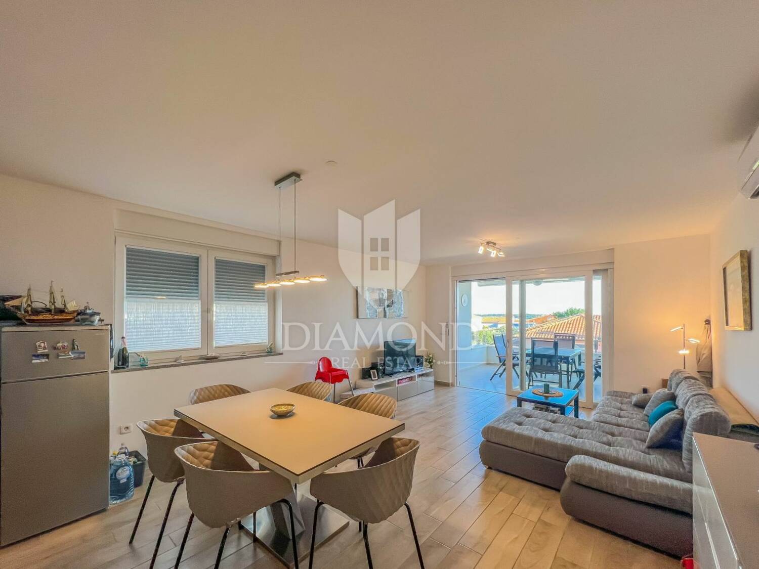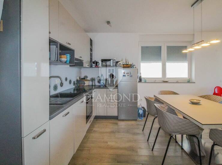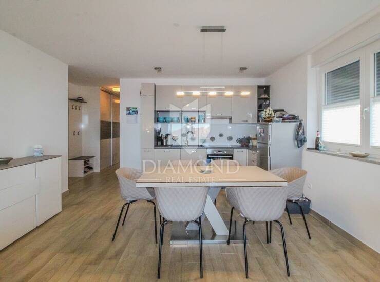 Stan se nalazi na 1.katu novije stambene zgrade, a površina stana iznosi 79.39 m2. Stan se sastoji od open space dnevnog boravka sa kuhinjom, 2 spavaće sobe, kupaonice, hodnika i prostrane natkrivene terase. Iz dnevnog boravka se izlazi na natkrivenu terasu sa koje se pruža lijepi pogled na more i na Novigrad. Terasa je idealna za druženje i uživanje. Stan se grije putem podnog grijanja i klima uređaja. Stan je kvalitetno i moderno opremljen te se kao takav i prodaje. U vlasništvu stana je i spremište površine 4.39 m2 koje se nalazi u podrumu zgrade. Stanu pripada i parkirno mjesto koje se nalazi odmah pored ulaza u samu zgradu.