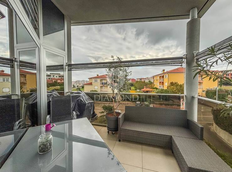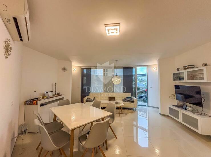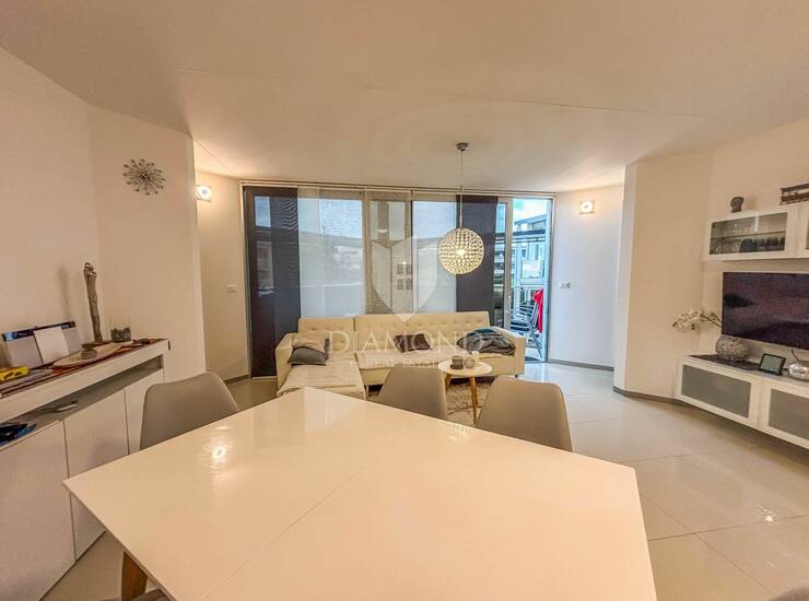 Stan se nalazi na drugom katu kvalitetne novogradnje s liftom, u mirnom i urednom okruženju koje pruža savršenu ravnotežu između privatnosti i blizine svih potrebnih sadržaja. Ovaj svijetao i funkcionalan stan površine preko 60 m² sastoji se od otvorenog prostora koji povezuje kuhinju, blagovaonicu i dnevni boravak, dvije udobne spavaće sobe obje s izlazom na balkon te moderno uređene kupaonice opremljene podnim grijanjem. Iz dnevnog boravka se izlazi na natkriven balkon od 4 m² s kojeg se pruža pogled prema mirnoj ulici.