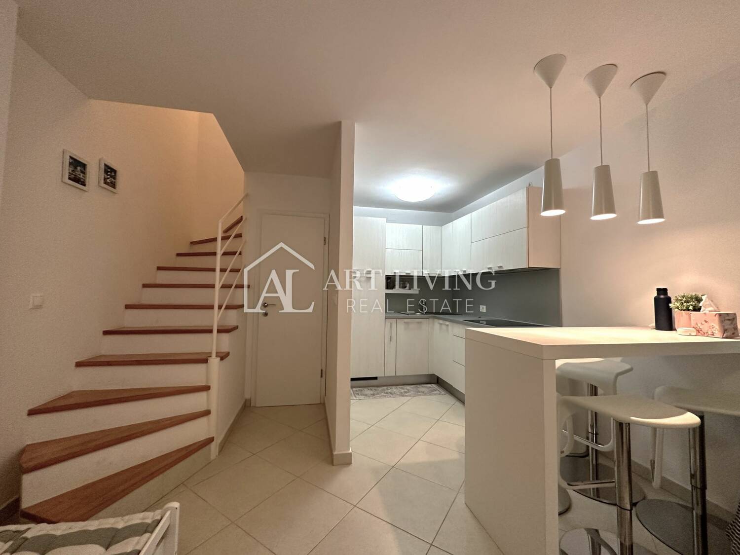 Stan ukupne površine 60 m2 proteže se kroz prizemlje i prvi kat. Prizemlje stana sastoji se od dnevnog boravka s kuhinjom i blagovaonicom otvorenog tipa, wc-a te prostrane terase idealne za ljetnja opuštanja. Unutarnjim stepeništem penjemo se na prvi kat gdje je smještena prostrana spavaća soba, kupaona te natkriveni balkon sa kojeg se pruža pogled na more.