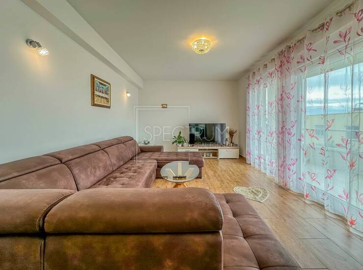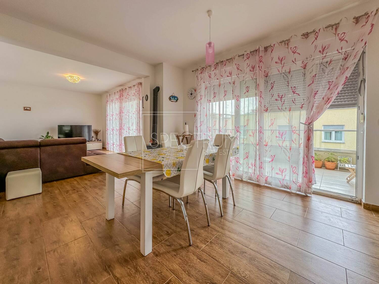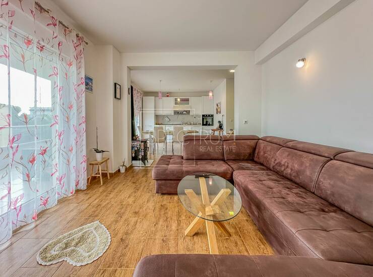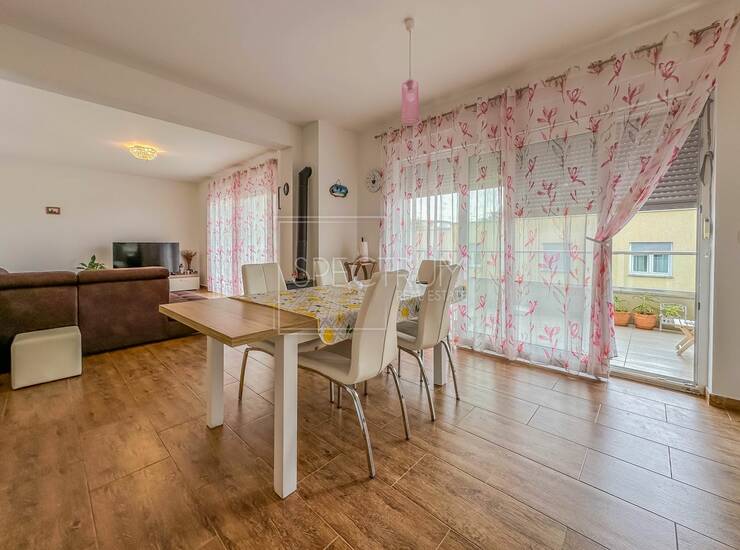 Stan se nalazi na 1.katu manje stambene zgrade. Površina stana iznosi 120.50 m2. Stan se sastoji od ulaznog hodnika, dnevnog boravka sa kuhinjom i blagovaonicom open space koncepta, 3 spavaće sobe, kupaonice, wc-a, ostave, prostrane natkrivene terase i još jedne manje terase. Unutarnjim stepenicama dolazi se do prostrane krovne terase sa koje se pruža predivan pogled na grad Novigrad i na more. Ova krovna terasa predstavlja idealan prostor za uživanje i druženje. Na krovnoj terasi postoji mogućnost ugradnje jacuzzija i vanjskog tuša. Zbog svoje veće površine, stan pruža veliki komfor. Stan se prodaje namješten. Grijanje je regulirano putem podnog grijanja na struju, klima uređaja i peći na drva. U vlasništvu stana su i 2 parkirna mjesta.