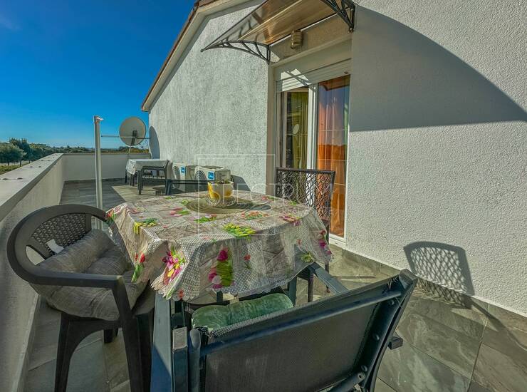 Stan se nalazi na 1.katu kuće sa 4 stambene jedinice. Površina stana iznosi 35 m2. Stan se sastoji od ulaznog hodnika, kuhinje sa blagovaonicom, sobe koja može poslužiti kao dnevna soba i kao spavaća soba, kupaonice i prostrane terase sa koje se pruža predivan pogled na more i na grad Novigrad. Na terasu se dolazi iz sobe. Grijanje je regulirano putem klima uređaja. Stan se prodaje namješten. Stanu pripada parkirno mjesto koje se nalazi u sklopu okućnice.