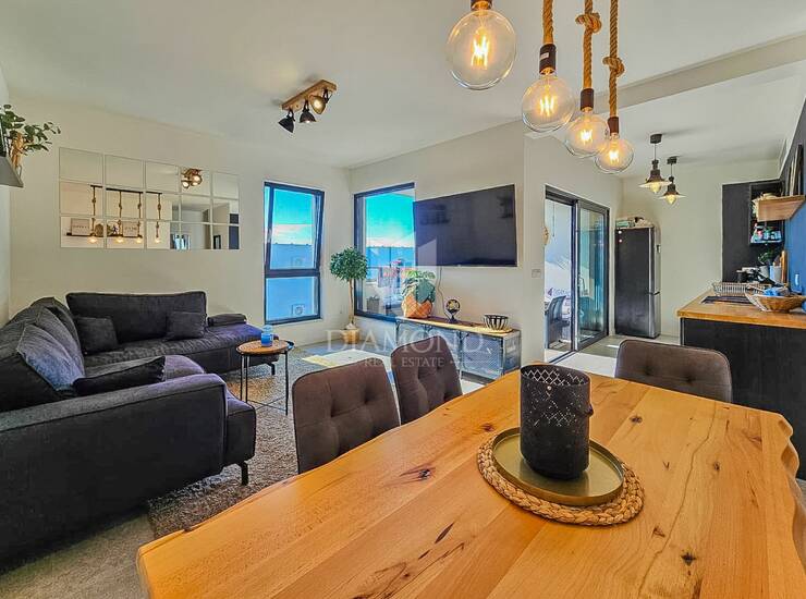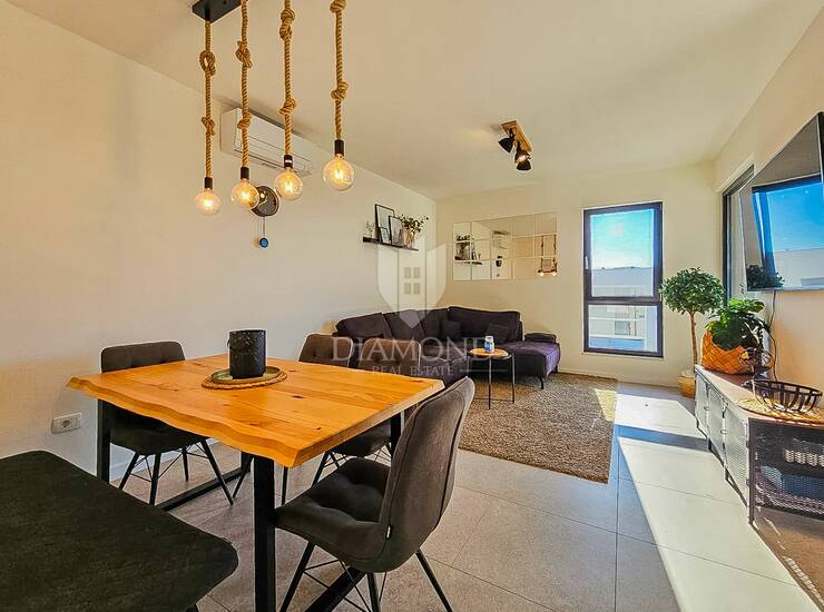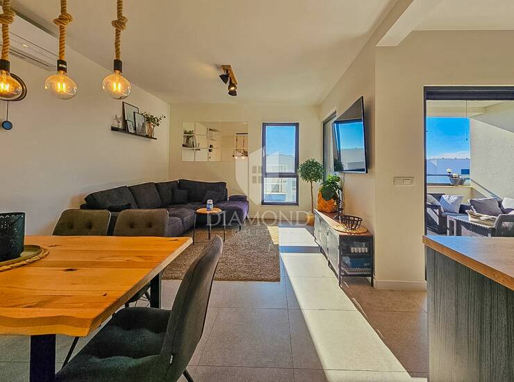 Stan je ukupne stambene površine 70 m² a odiše funkcionalnošću, svjetlošću i osjećajem prozračnosti. Otvoreni koncept dnevnog boravka, kuhinje i blagovaonice, dodatno naglašen velikim staklenim stijenama, omogućuje obilje prirodnog svjetla tijekom cijelog dana i stvara ugodnu, toplu atmosferu. Dvije komforne spavaće sobe pružaju mir i privatnost, dok su kupaonica i dodatni WC izvedeni u modernom i elegantnom stilu. Natkrivena terasa s djelomičnim pogledom na more savršeno je mjesto za opuštanje i uživanje u mediteranskom ambijentu. Stan je potpuno namješten i opremljen klimatskim sustavom za grijanje i hlađenje te dolazi s vlastitim parkirnim mjestom i spremištem, što dodatno povećava praktičnost i vrijednost nekretnine.