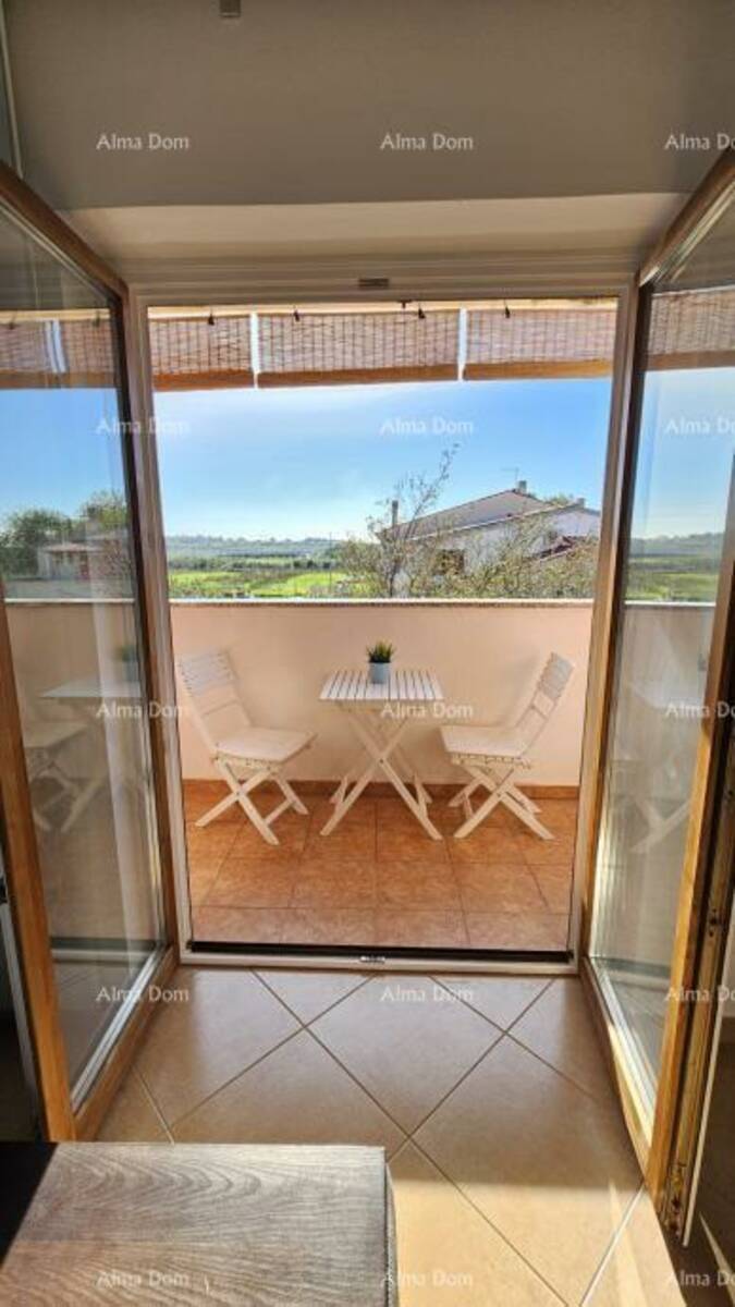 Iz dnevnog boravka i balkona je otvoreni pogled na okolna polja i vinograde a iz spavaće sobe je pogled na parking i šumu.