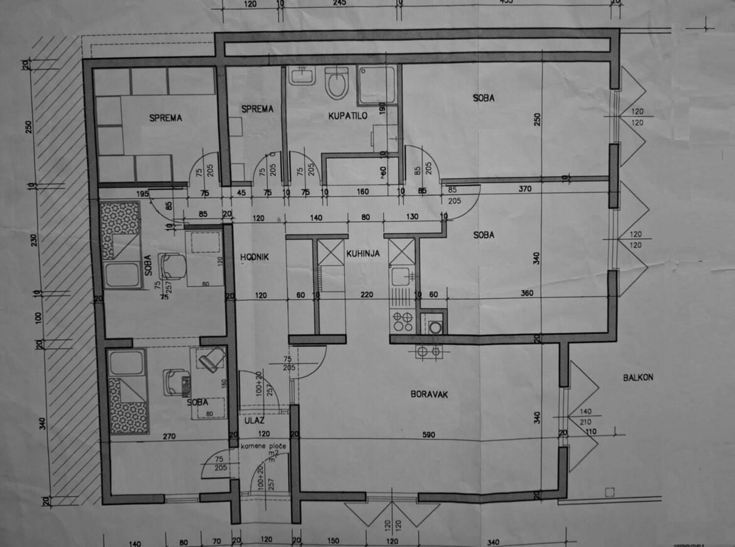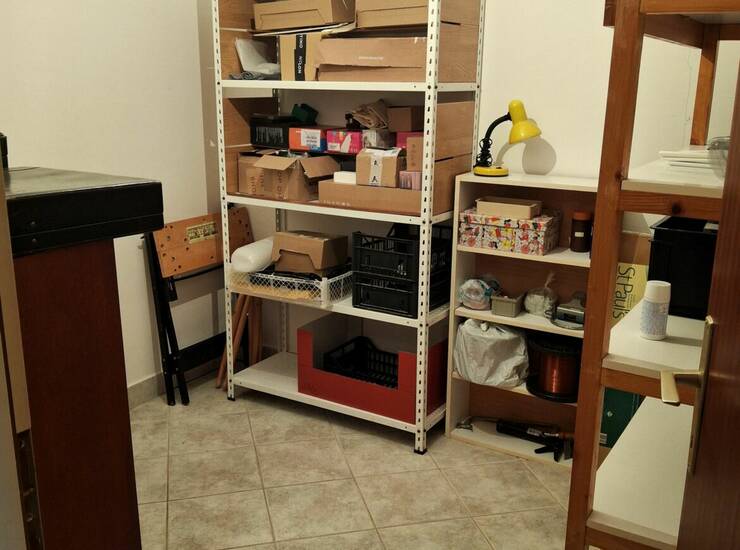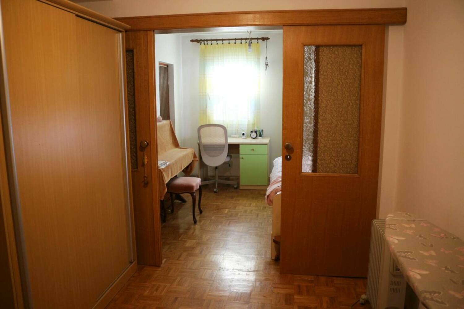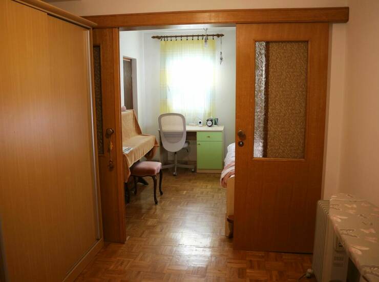 The apartment is oriented to the south and west and consists of three bedrooms, a large living room with a dining area and extended kitchen, a hallway, a bathroom, and two storage rooms. There is potential to transform smaller storage room into an extra toilet.