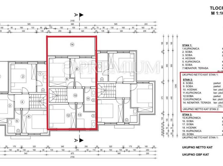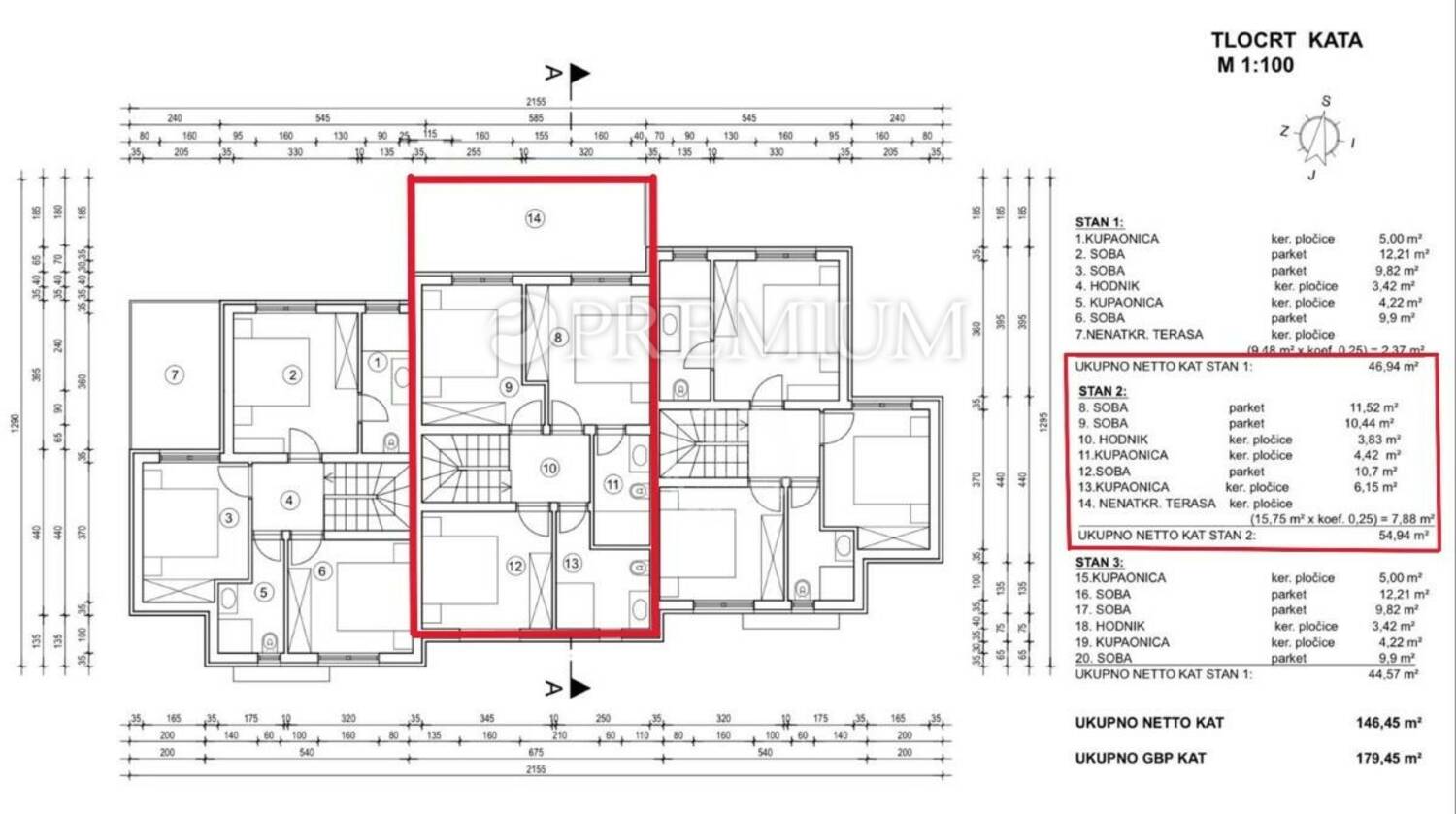 Kat se sastoji od hodnika, tri spavaće sobe od kojih dvije imaju izlaz na terasu i dvije kupaonice.