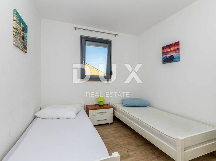 Na prvom katu se nalazei dva apartmana. Jedan je dvosobni apartman s lijepim balkonom, a drugi je studio apartman. Na drugom katu se nalaze tri apartmana, dva studio apartmana i jedan jednosobni s dnevnim boravkom. Pogled na more imaju svi apartmani. Objekt u lijepo uređenoj okućnici ima i 5 parkirnih mjesta. Ovaj objekt se izdvaja odličnom lokacijom, drugi red do mora u Njivicama i uhodaniom turističko-ugostiteljskom djelatnosti. Ne prodaje samo objekt, već i uhodan posao.