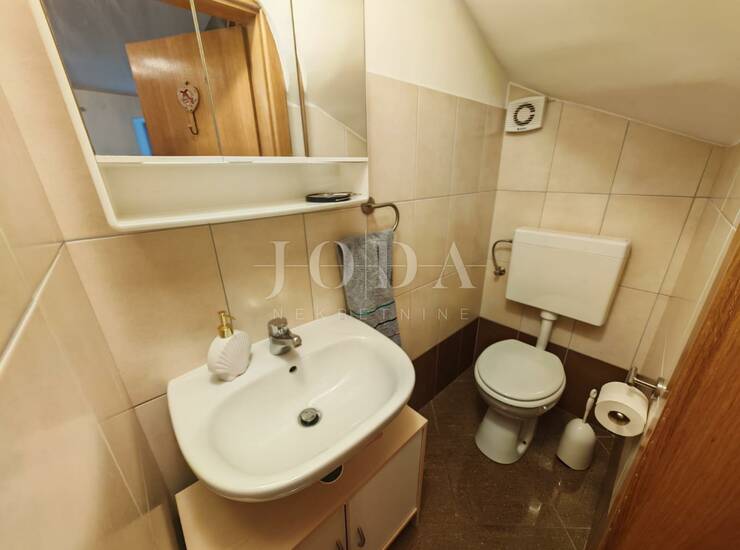 Na prvom katu smještena je kupaonica i spavaća soba, dok se u potkrovlju nalazi dodatna soba sa dva kreveta.