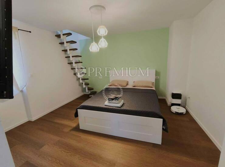 Unutarnje stepenice vode na kat gdje su smještene dvije spavaće sobe, svaka s vlastitom kupaonicom. Jedna spavaća soba ima pogled na more, dok druga raspolaže galerijom koja je trenutačno neuređena te ostavlja budućem vlasniku mogućnost uređenja sukladno vlastitim željama i potrebama, uz dodatni pogled prema moru kroz krovni prozor. Kuća je opremljena ALU i PVC stolarijom, podnim oblogama od keramike i vinila, podnim grijanjem na dizalicu topline, klima uređajima u svim prostorijama te protuprovalnim vratima, čime je osigurana visoka razina energetske učinkovitosti i udobnosti.