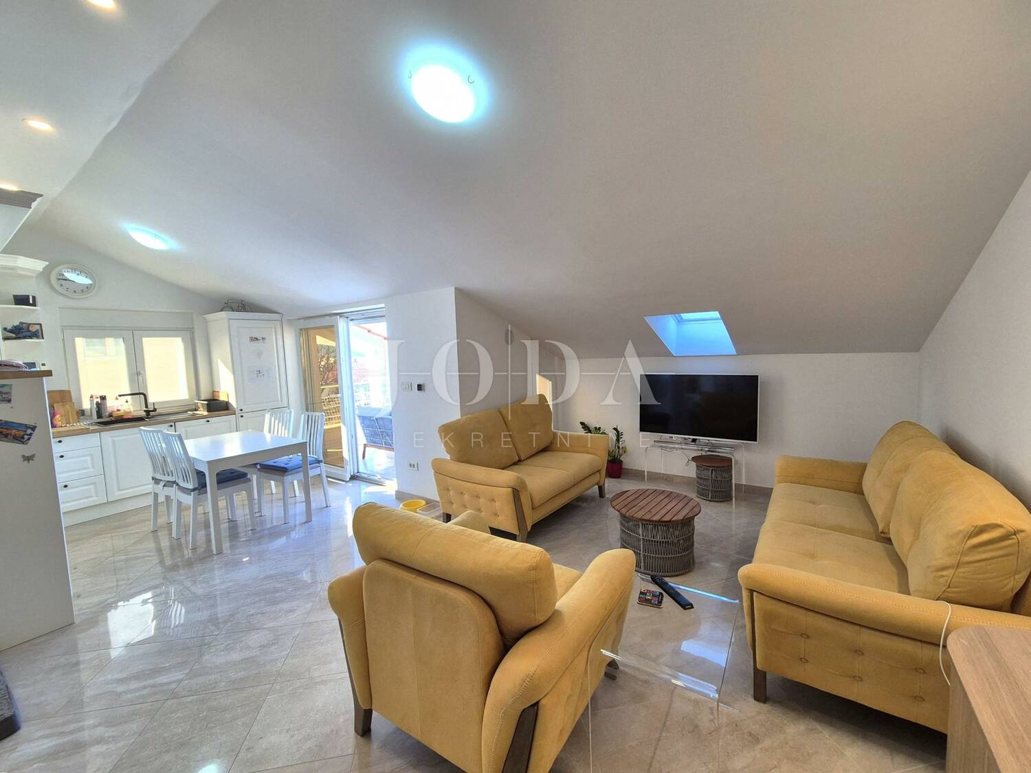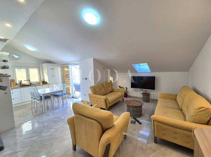 Apartman se nalazi na drugom katu poluugrađenog objekta sa četiri stambene jedinice i ima tlocrtnu površinu od 77.95 m2. Sastoji se od ulaznog hodnika, dnevnog boravka s kuhinjom i blagovaonom, kupaonice, dvije spavaće sobe i terase o otvorenim pogledom na more. U izgradnji su se koristili kvalitetni materijali te ima podno grijanje s daljinskim upravljanjem, PVC stolariju s roletama, protuprovalna vrata i multi split klimatizaciju sa 3 klima uređaja za grijanje-hlađenje svih prostorija. U potpunosti je namješten te se takav i prodaje. Apartmanu pripada jedno parkirno mjesto i okućnica površine 28.65 m2 natkrivena metalnom pergolom na koju se može postaviti sjenilo. Nalazi se u mirnom predjelu Njivica, samo 500 metara od mora! Svi bitni sadržaji kao što su restorani i trgovine se nalaze u centru, a također je važno istaknuti blizinu zračne luke. Za više informacija i dogovor ogled nekretnina, kontaktirajte nas!