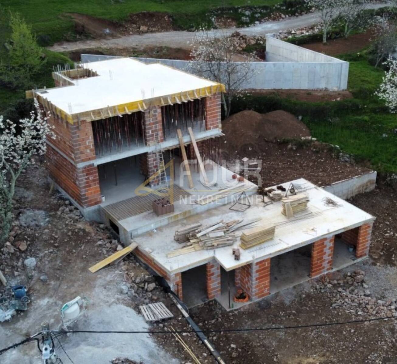 U ponudi je novogradnja započeta 2025. godine, a projekt obuhvaća modernu obiteljsku vilu od približno 230 m2 te dodatnu samostojeću kuću od 80 m2. Oba objekta nalaze se u visokom roh-bau stanju, s riješenim komunalijama te dovedenom strujom i vodom na terenu, a prema projektu predviđeni su privatni bazeni, uređene okućnice i parkirna mjesta.