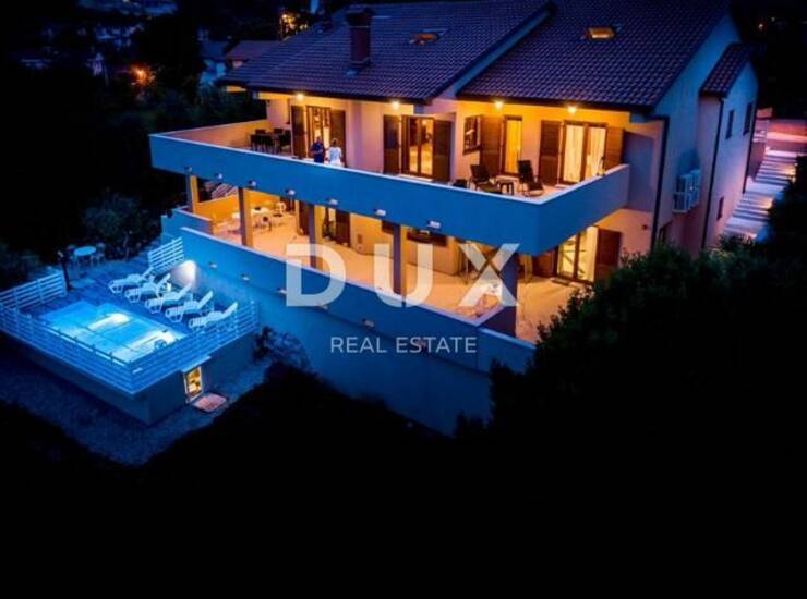 Prodaje se kuća u bližoj okolici Opatije (2km od Slatine) koja se sastoji od tri etaže s 5 spavaćih soba, 7 kupaonica, 4 velika dnevna boravka, 4 profesionalne kuhinje, 2 terase od po 120 m2 s jedinstvenim pogledom na Kvarner, park s bazenom, garaža za dva automobila, 8 parkirnih mjesta, pet kućnih ulaza, 11 klima uređaja i mnogi drugi sadržaji: saune, bazeni, biljar, voćnjak, vinograd.