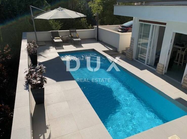Okućnicu od 450 m2 krase raznovrsne bilje voća te bazen sa sunčalištem. Na okućnici stanu dva auta te jedno parkirno mjesto u garaži. Za grijanje postoji etažno na lož ulje, no većinom se koristi klima uređaji. Odlična nekretnina 450m zračne linije do centra Opatije.