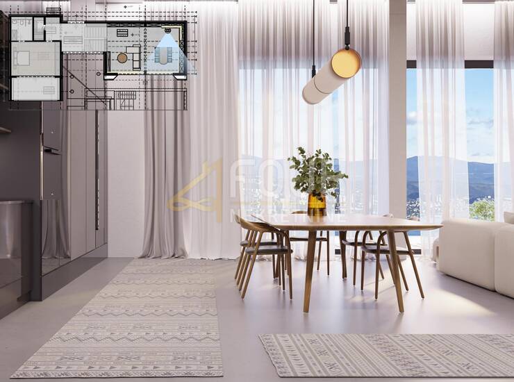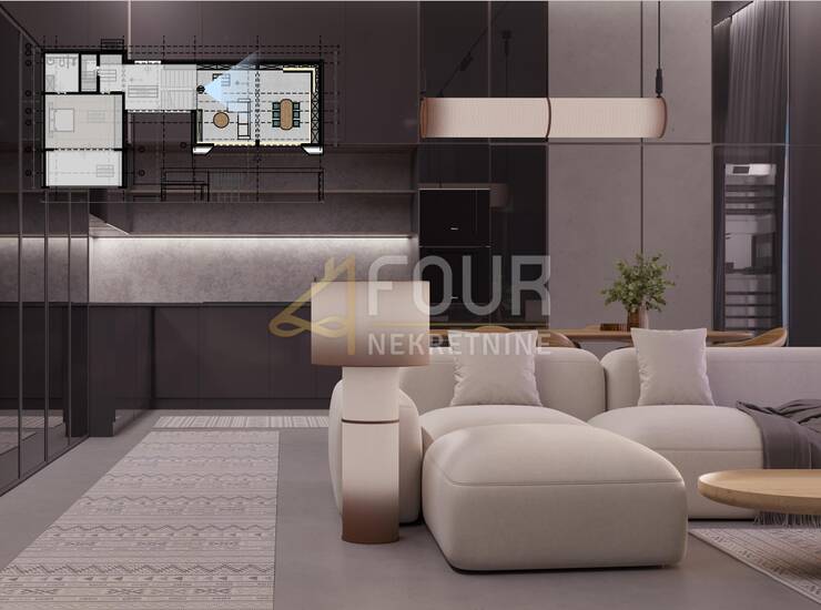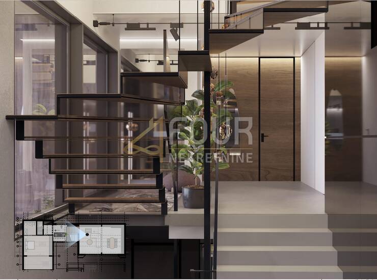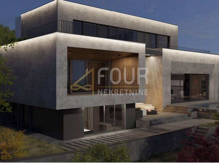 Vila se prostire na tri etaže – suterenu, prizemlju i katu – s ukupno 348 m2 stambene površine na parceli od 1.008 m2. Prostrani i svijetli interijeri povezani su s eksterijerom velikim staklenim stijenama, dok spoj prirodnih materijala poput drva i betona stvara savršen sklad topline i modernosti.