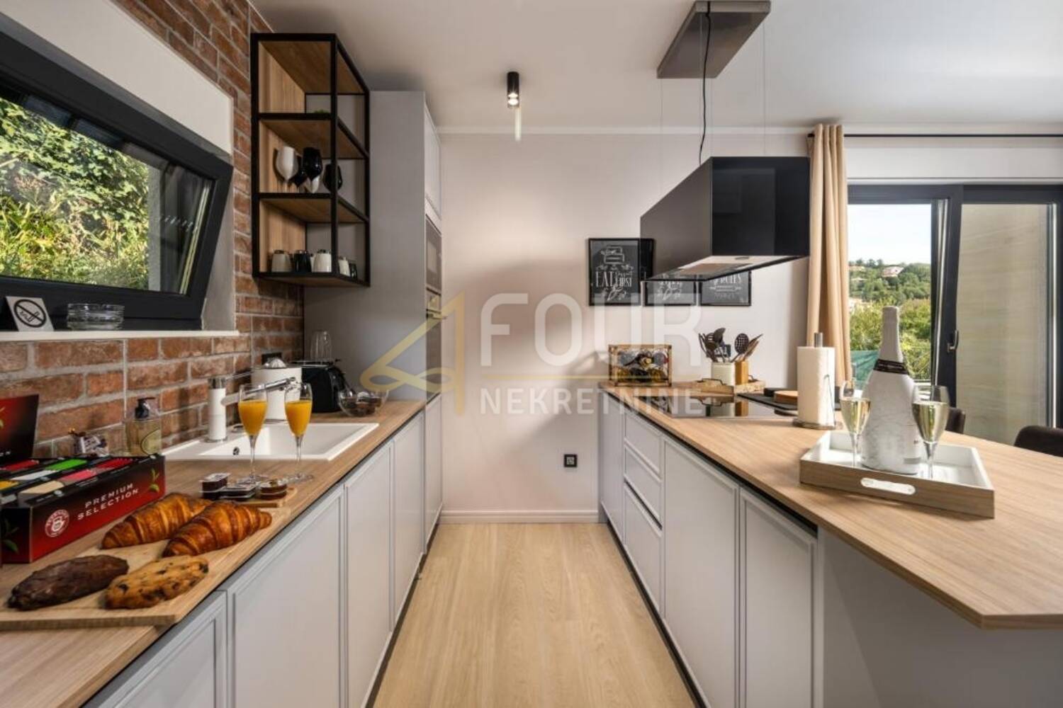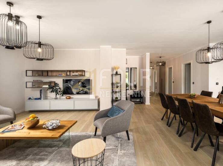 U nastavku dnevnog prostora proteže se natkrivena terasa s blagovaonskim stolom za osam osoba, idealna za druženja uz pogled na okolicu i impresivan bazen od 38 m2. U sklopu okućnice nalazi se njegovan vrt, roštilj zona, kotlovnica te prostran prostor za parkiranje s pet parkirnih mjesta.