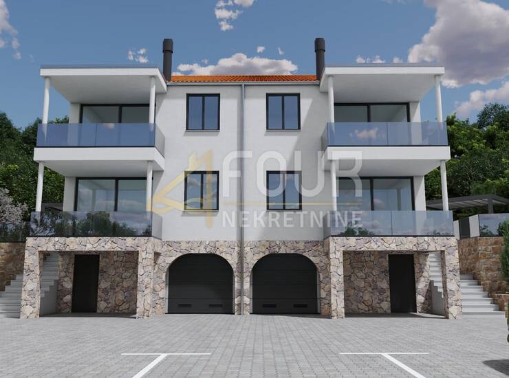 Prodaje se dvojna kuća u izgradnji, roh bau fazi, na atraktivnoj lokaciji na Veprincu, okružena mirom i zelenilom, s pogledom na more u daljini.