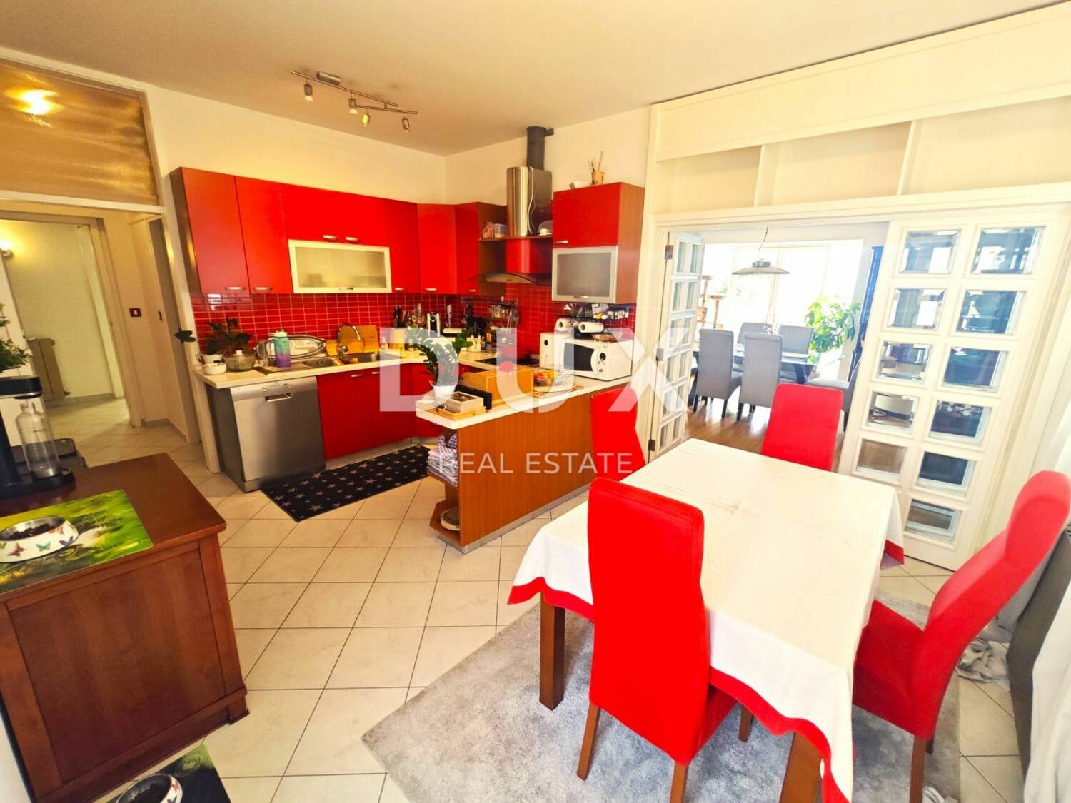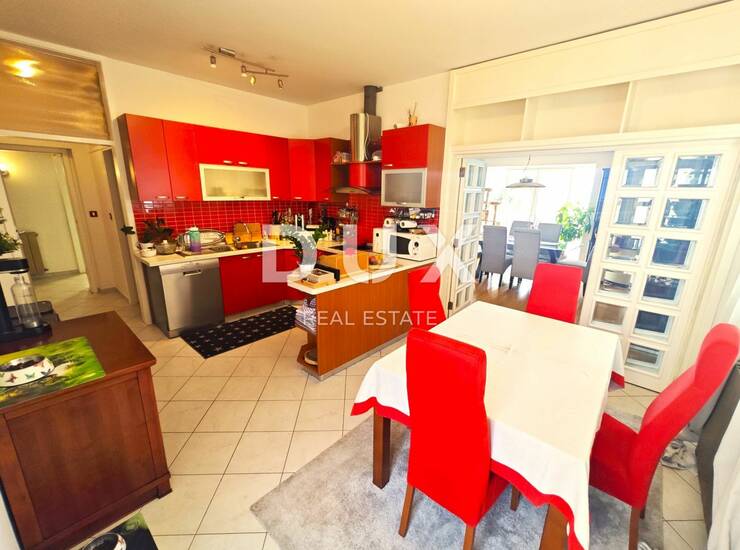 Nekretnina se sastoji od prizemlja i jednog kata. U prizemlju su garaža od 40m2, kotlovnica i konoba od 80m2. Na katu se nalazi stan od 163 m2 s terasom koja okružuje cijeli kat. S terase se ulazi u vrt koji je ukusno uređen. Stan se sastoji od tri spavaće sobe, dvije kupaonice, hodnika, kuhinje s blagovaonom i prostranog dnevnog boravka iz kojeg se pruža pogled na more. Stan je lijepo uređen, a prostor je vrlo funkcionalan. Vlasnici posjeduju i projektnu dokumentaciju za bazen.