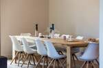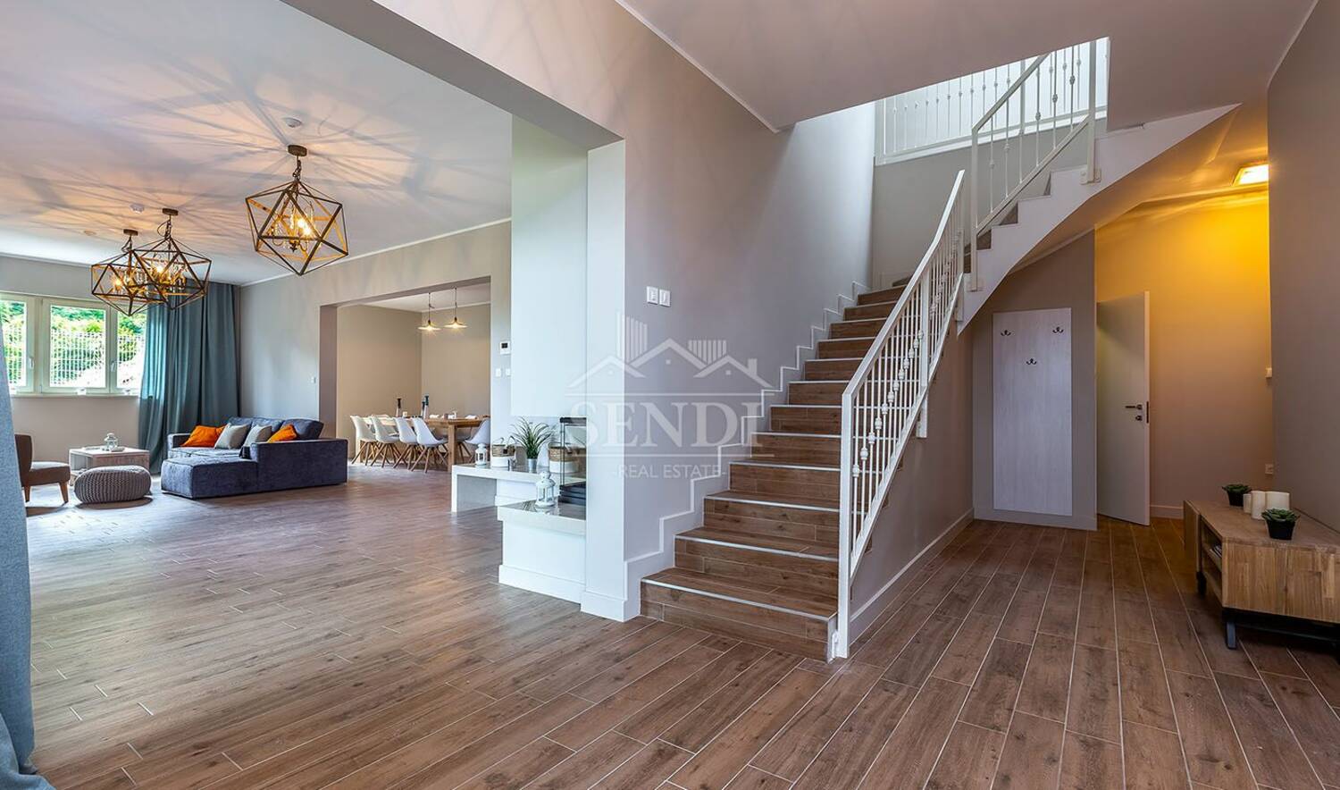 Na dvije luksuzno opremljene etaže cca 400 m2, smještene su 5 spavaćih soba sa vlastitim garderobama, 5 kupaonica, prostrani dnevni boravak sa kuhinjom i blagovaonicom, teretana i sauna. Prizemlje zauzima open space dnevni boravak i blagovaona prilagođen za za druženje, gdje se u centralnom dijelu nalazi veliki stol za deset osoba te kamin na drva. Veliki stakleni otvori povezuju cijelo prizemlje sa uređenim terasama i sunčalištem, te grijani bazen dimenzija 12x6 m.