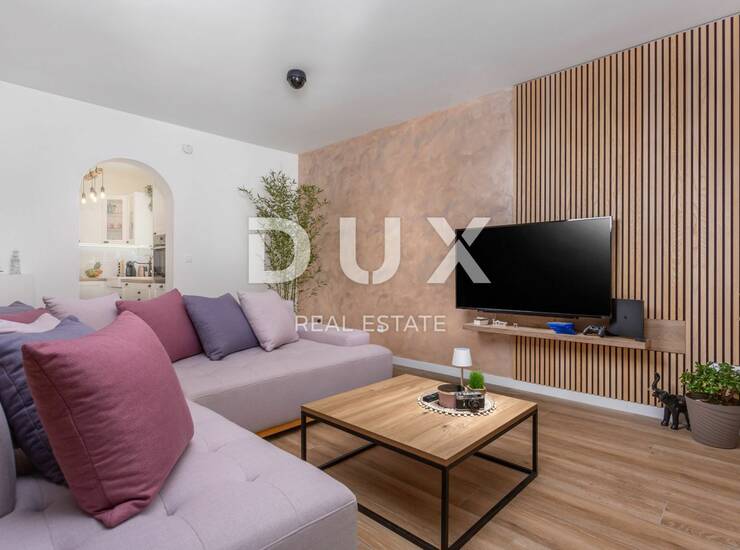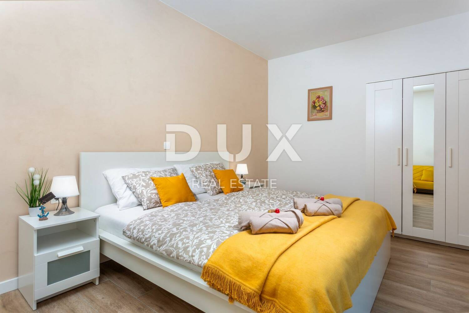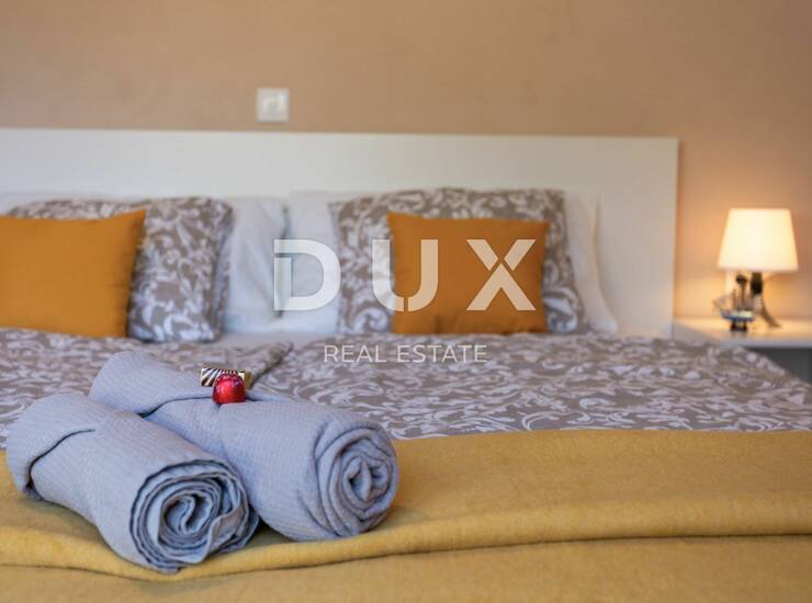 Kuća se prostire na dvije etaže i odiše prostranošću, svjetlošću i vrhunskom kvalitetom materijala. U prizemlju dominira elegantan dnevni boravak s kaminom, povezan s prostranom blagovaonicom i moderno opremljenom kuhinjom. Staklene stijene povezuju interijer s vanjskom terasom, stvarajući besprijekoran protok svjetlosti i otvarajući pogled na mediteranski vrt i bazen. Na istoj etaži nalazi se i poseban apartman (1S+DB), koji može služiti kao gostinjski prostor ili zasebna jedinica za najam.