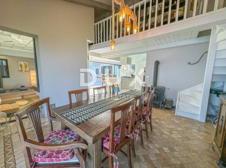 Ističemo prekrasan glavni open space prostor dnevni boravak koji je idealan za više aktivnosti od samo druženja, a povezan je i s prostranom blagovaonicom i kuhinjom, pritom cijeli prostor ima prekrasan i nesmetan pogled na Kvarnerski zaljev, a iz blagovaonice se izlazi na šarmantni balkon na kojem zastaje dah od pogleda. Iz lijepo uređene i potpuno opremljene kuhinje izlazi se na terasu s bazenom.
