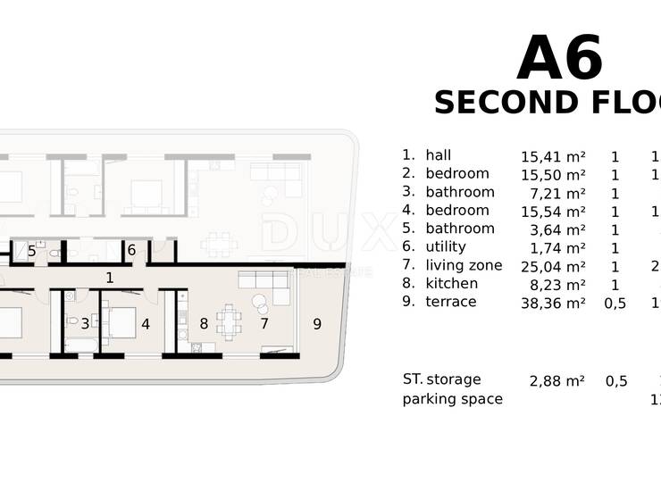 Stan je dizajniran za maksimalnu udobnost i luksuzan životni stil. Na raspolaganju su prostrani ulazni hodnik, ostava, dvije spavaće sobe, dvije moderne kupaonice, dnevni boravak s kuhinjom i blagovaonicom te velika terasa – idealna za uživanje u jutarnjoj kavi ili večernjem opuštanju uz spektakularan panoramski pogled na more.