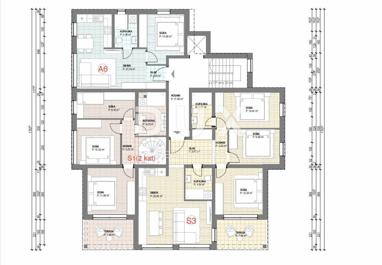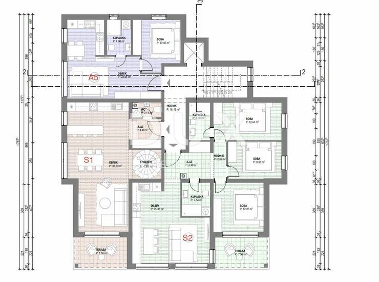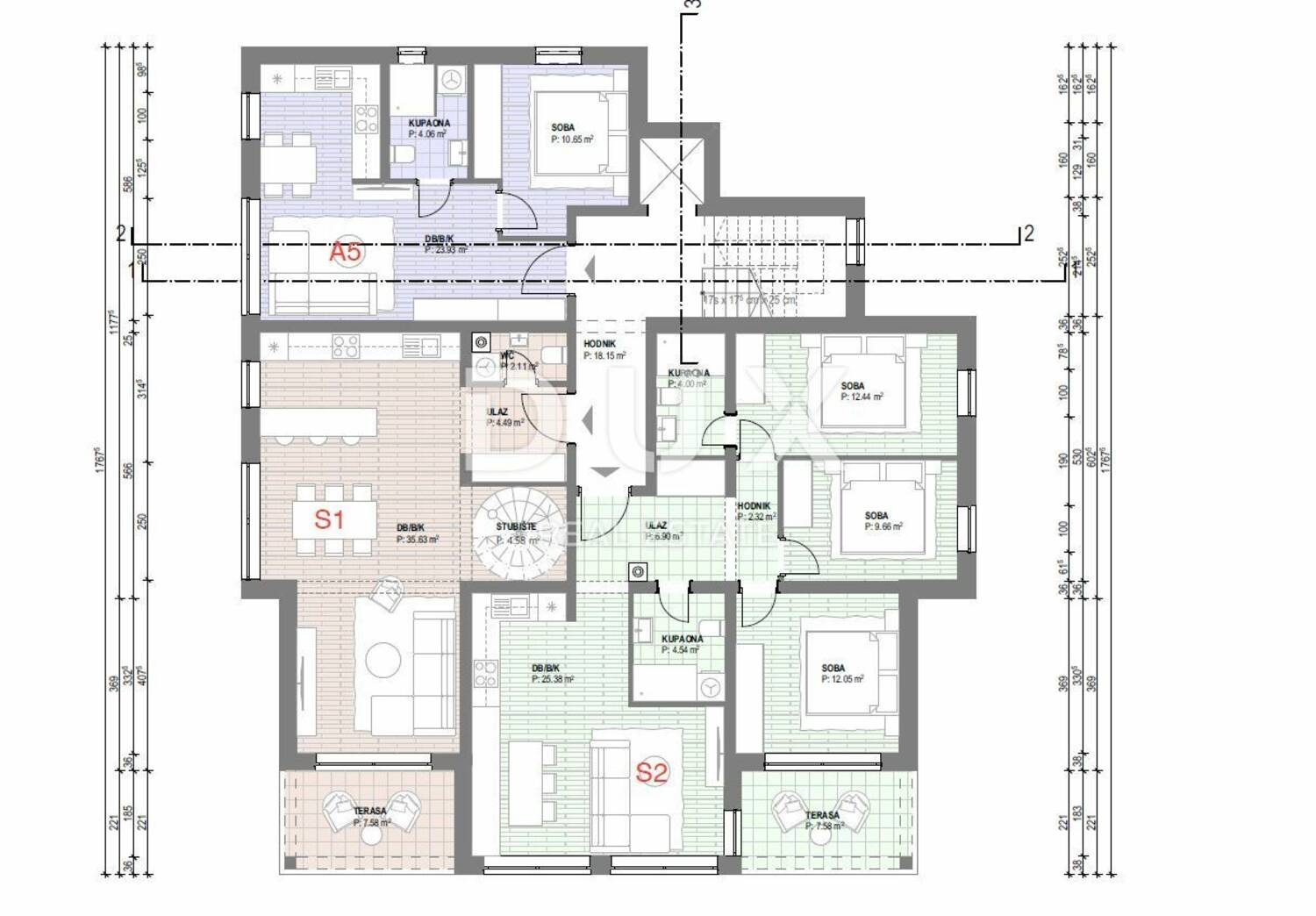 Dvoetažni stan S1 veličine 96m2 nalazi se na 1. katu & 2. katu stambene zgrade i sastoji se od hodnika, dnevnog boravka s kuhinjom i blagovaonicom (36m2), 3 spavaće sobe, 1 kupaonica + 1 WC i dvije terase s panoramskim pogledom na more.