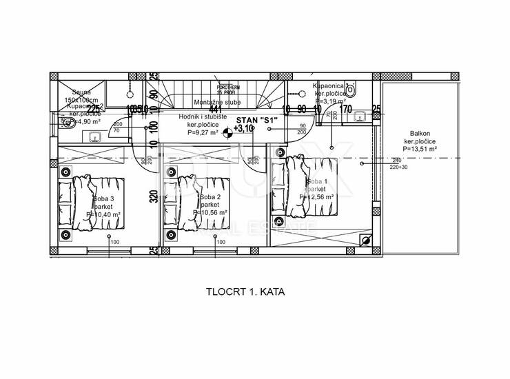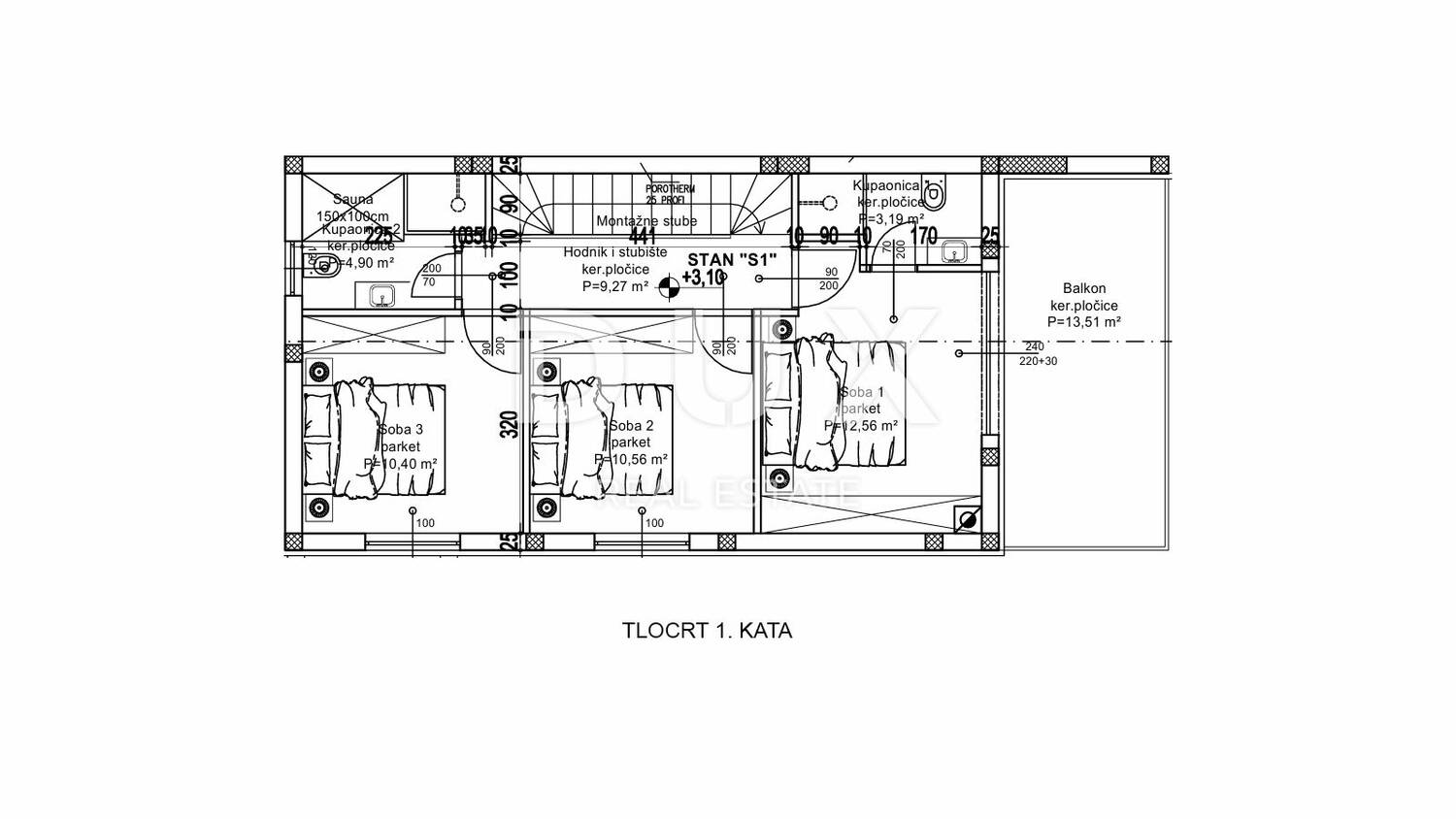 Kat: tri spavaće sobe, dvije kupaonice, hodnik i natkriveni balkon (13,51 m²) s pogledom na more