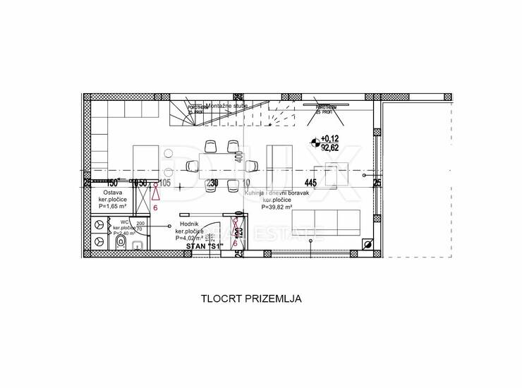 Prizemlje: prostrana terasa, djelomično natkrivena, dnevni boravak s kuhinjom i blagovaonicom, hodnik, toalet i ostava
