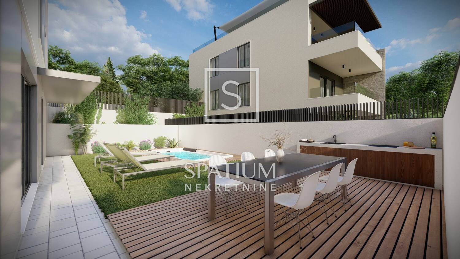 Prizemlje stana obuhvaća prostrani dnevni boravak povezan s kuhinjom i blagovaonicom, hodnik, gostinjski toalet i praktičnu ostavu. Iz dnevnog prostora izlazi se na veliku terasu okrenutu prema moru, savršenu za uživanje u suncu i svježem zraku. Terasa će biti opremljena instalacijama za vanjsku ljetnu kuhinju i nadzemni bazen, čime se otvara mogućnost kreiranja pravog ljetnog dnevnog boravka na otvorenom.