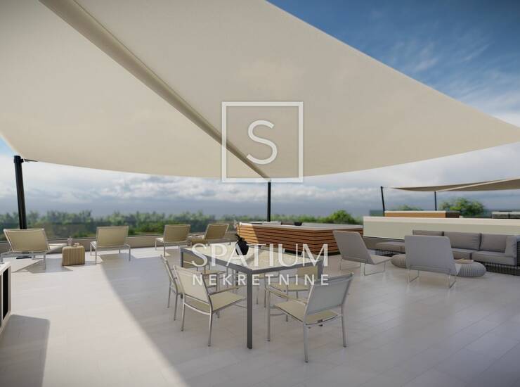 Na krovnoj terasi predviđena je ugradnja bazena ili jacuzzija, a zahvaljujući izdašnoj kvadraturi, postoji mogućnost uređenja ljetne kuhinje, lounge zone, sunčališta i prostora za druženje – sve uz panoramski pogled koji ostavlja bez daha. Ova terasa nudi pot