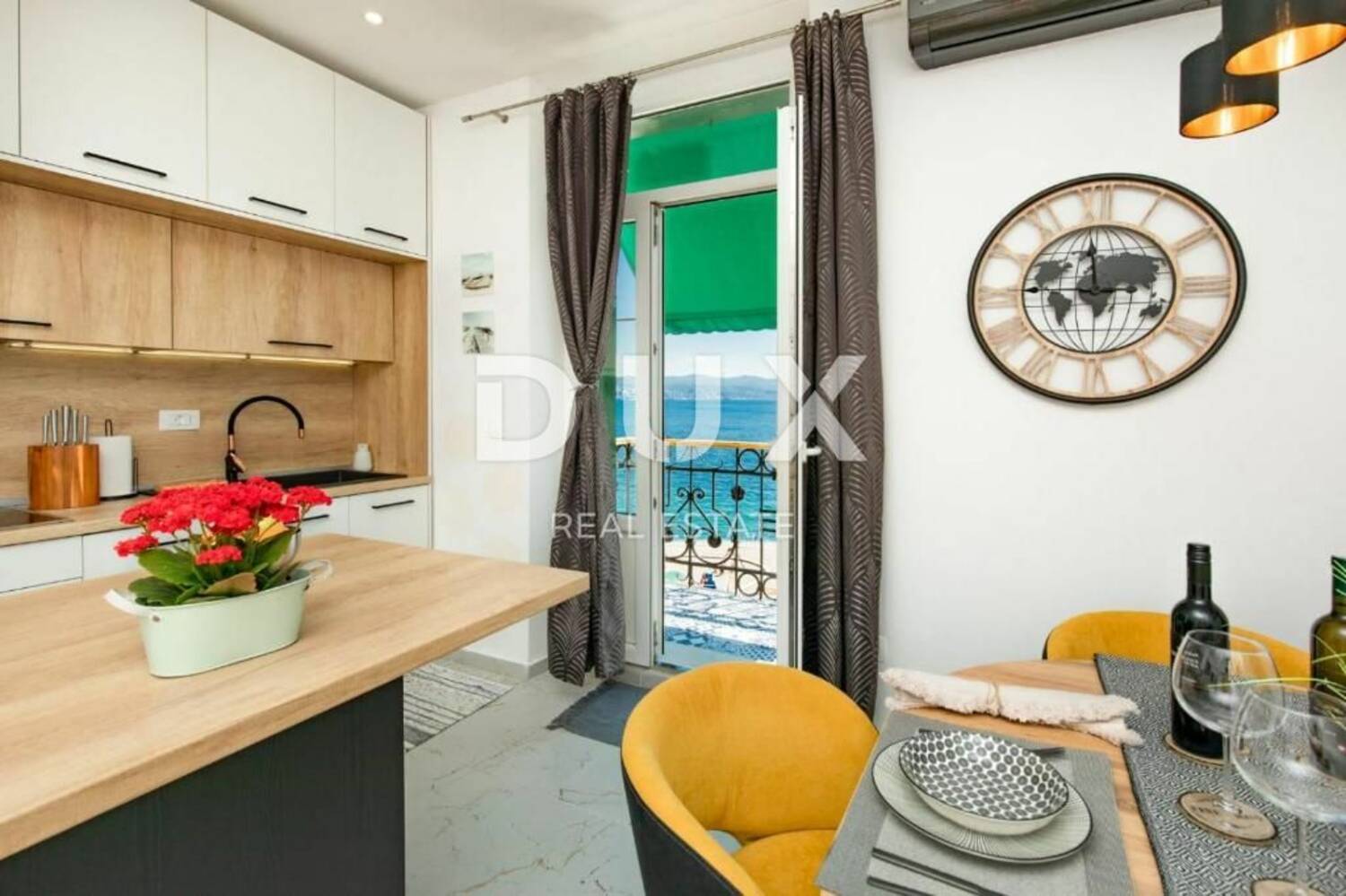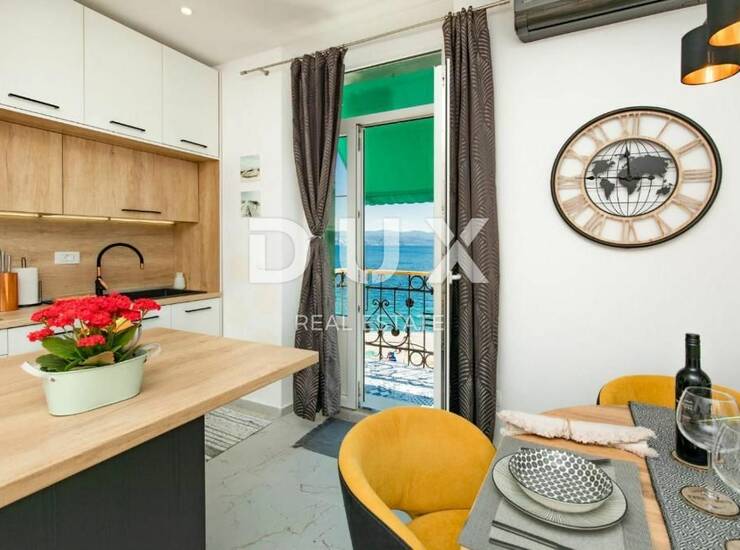 U ponudi DUX nekretnina izdvajamo prekrasno uređen i topao stan u centru Opatije prvi red do mora s čak 2 balkona s pogledom na more.