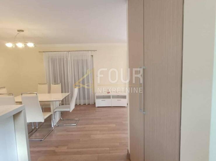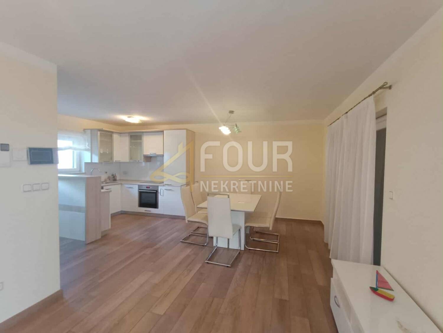 Opremljen je podnim grijanjem, PVC stolarijom i kvalitetnim parketom. Posebnu vrijednost pružaju dvije terase – natkrivena na prvom katu i otvorena u potkrovlju – obje s lijepim pogledom na more. Uz stan dolazi i vanjsko parkirno mjesto zaštićeno rampom.