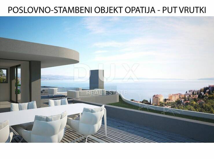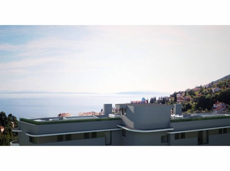 Novogradnja nedaleko centra Opatije, vrhunska gradnja stanova prekrasne arhitekture sjedinjene sa mediteranskim okruženjem i zavidnim pogledom na more. Podijeljena je na dva suterena od kojih je jedan garaža za stanare, a drugi podijeljena na velika spremišta, zatim prizemlje i dva kata spojenih liftom. Svakome stanu pripada jedno prostrano spremište te po tri parking mjesta u garaži.Kvalitetna gradnja ovih stanova te neponovljivi dizajn okoliša i samog stambenog prostora, imperativ je za kupce koji imaju zavidan buđet i jedinstven životni stil. Ovaj prekrasan i prostran trosoban stan sa dnevnim dijelom od ukupno 215m², se nalazi na drugome katu, južne, sjeverne i istočne orijentacije sa prekrasnom terasom, krovnom terasom od 53.91 m² s bazenom od 24 m² sa kojih se pruža panoramski pogled na Kvarner. Stan se sastoji od komotnog dnevnog boravka sa blagavaonom i kuhinjom te tri spavaće sobe sa tri kupaonice.