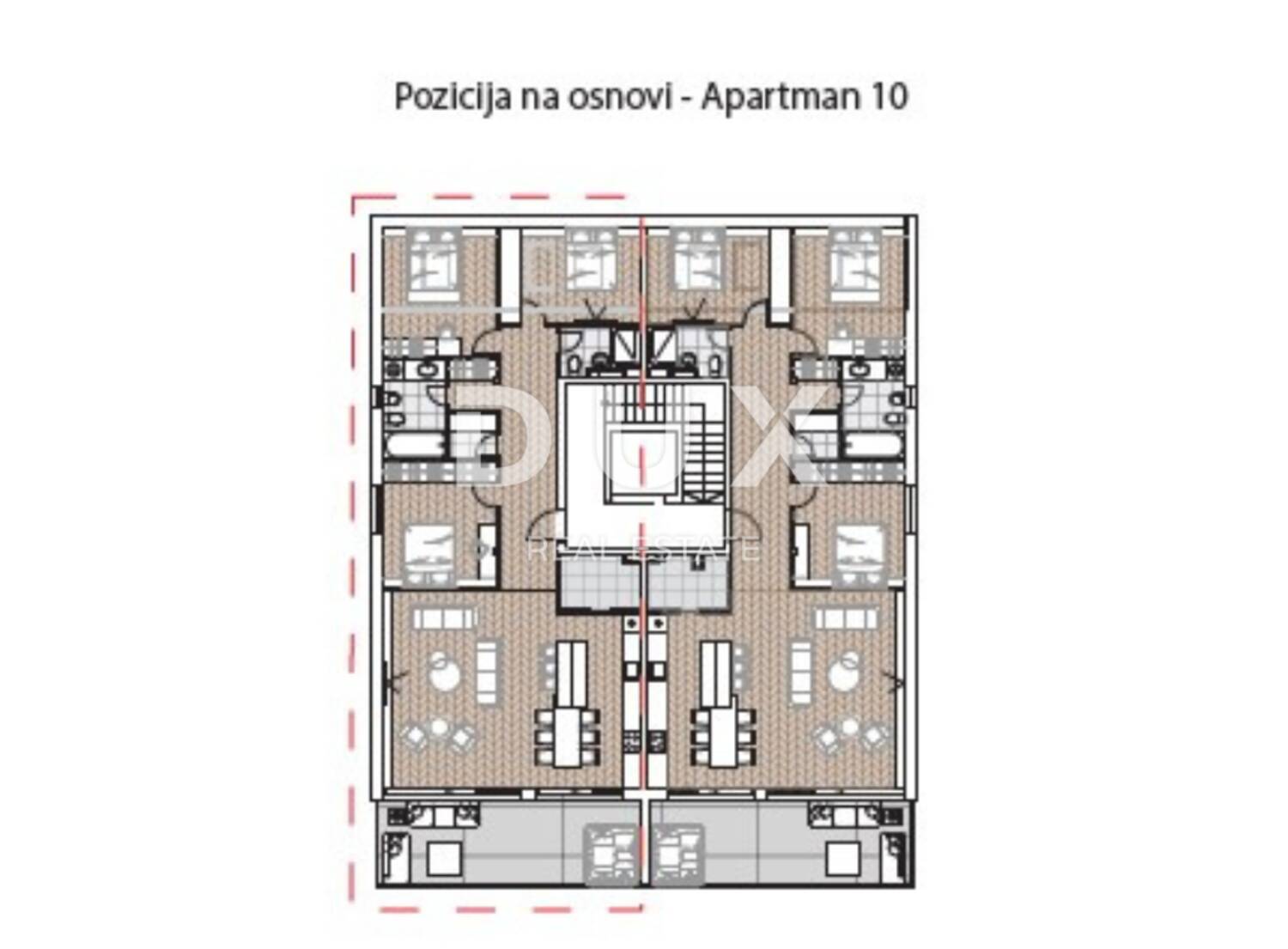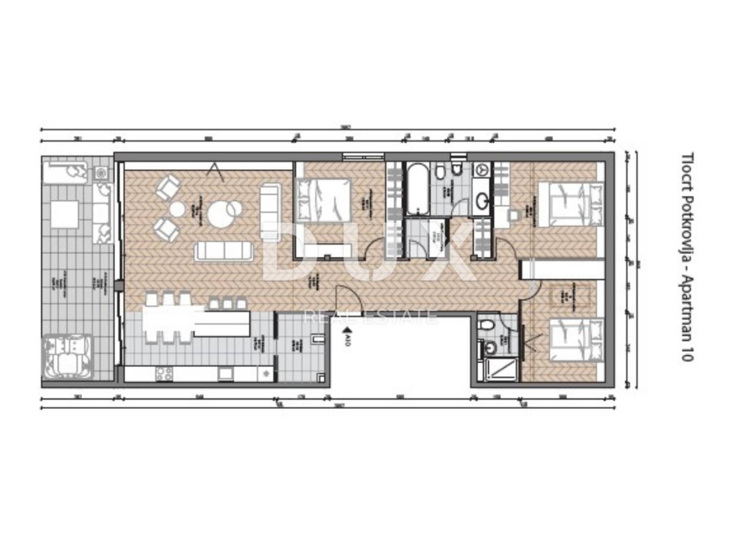 Stan se sastoji od tri spavaće sobe s 3 en suite kupaonicama, prekrasnim open space dnevnim boravkom, blagovaonicom i kuhinjom kvadrature 46,14 m2.