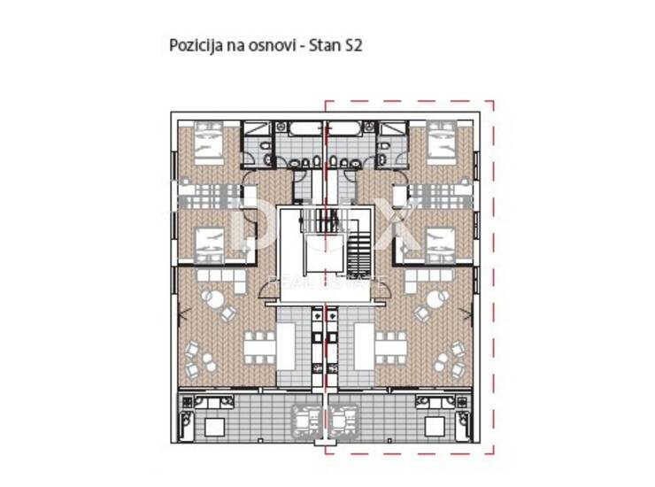Stan se sastoji od dvije spavaće sobe s en suite kupaonicama, prekrasnim open space dnevnim boravkom, blagovaonicom i kuhinjom kvadrature 43 m2.