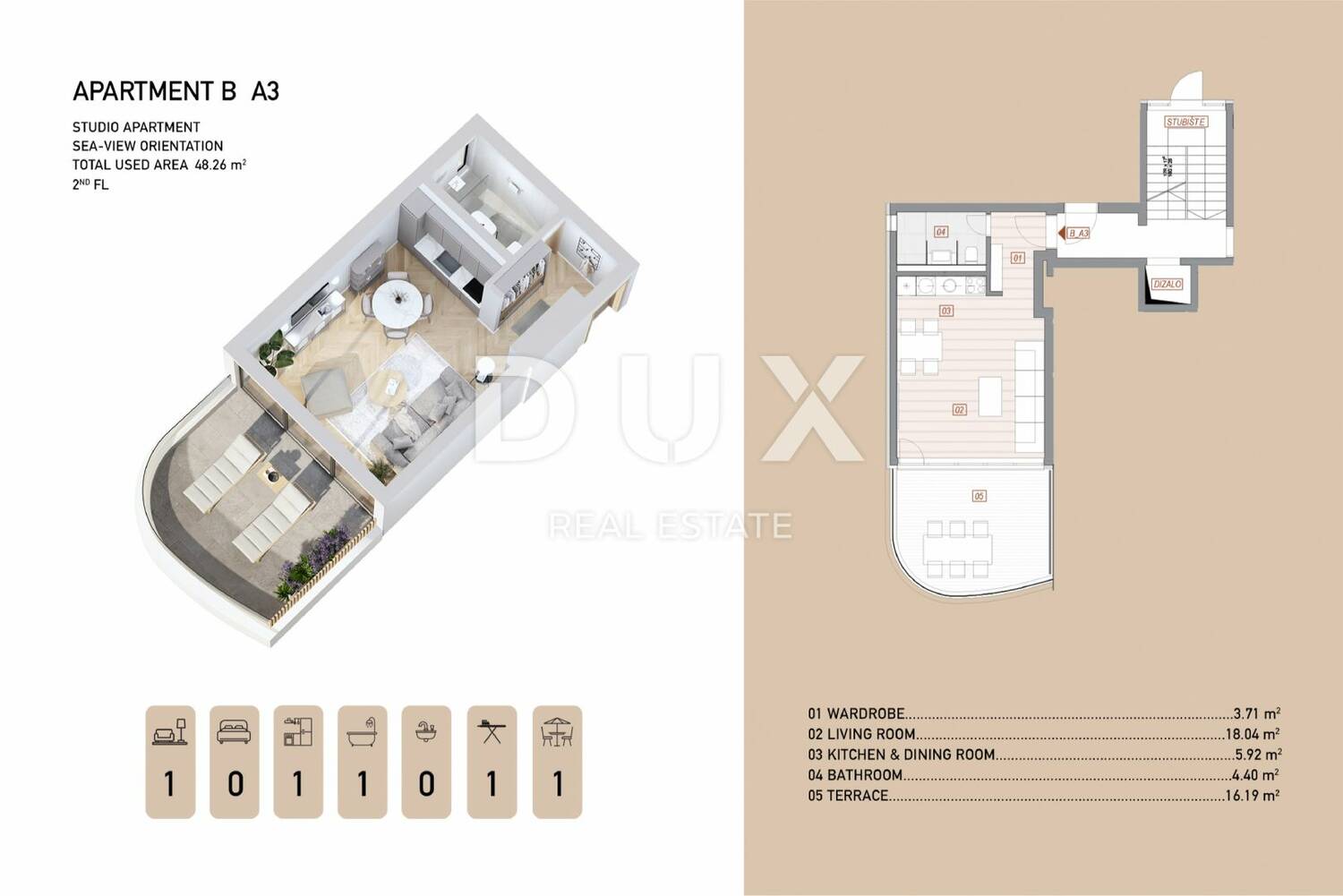Ovaj ekskluzivni projekt sastoji se od dvije moderno dizajnirane zgrade, savršeno uklopljene u mediteranski pejzaž, a svaka zgrada sadržavat će šest stanova različitih kvadratura (od 48 m² do 240 m²). Posebnu vrijednost predstavljaju penthouse stanovi s panoramskim pogledom, kao i stanovi u prizemlju s privatnim terasama i vrtovima. Svaka jedinica pruža neometan pogled na Kvarnerski zaljev.